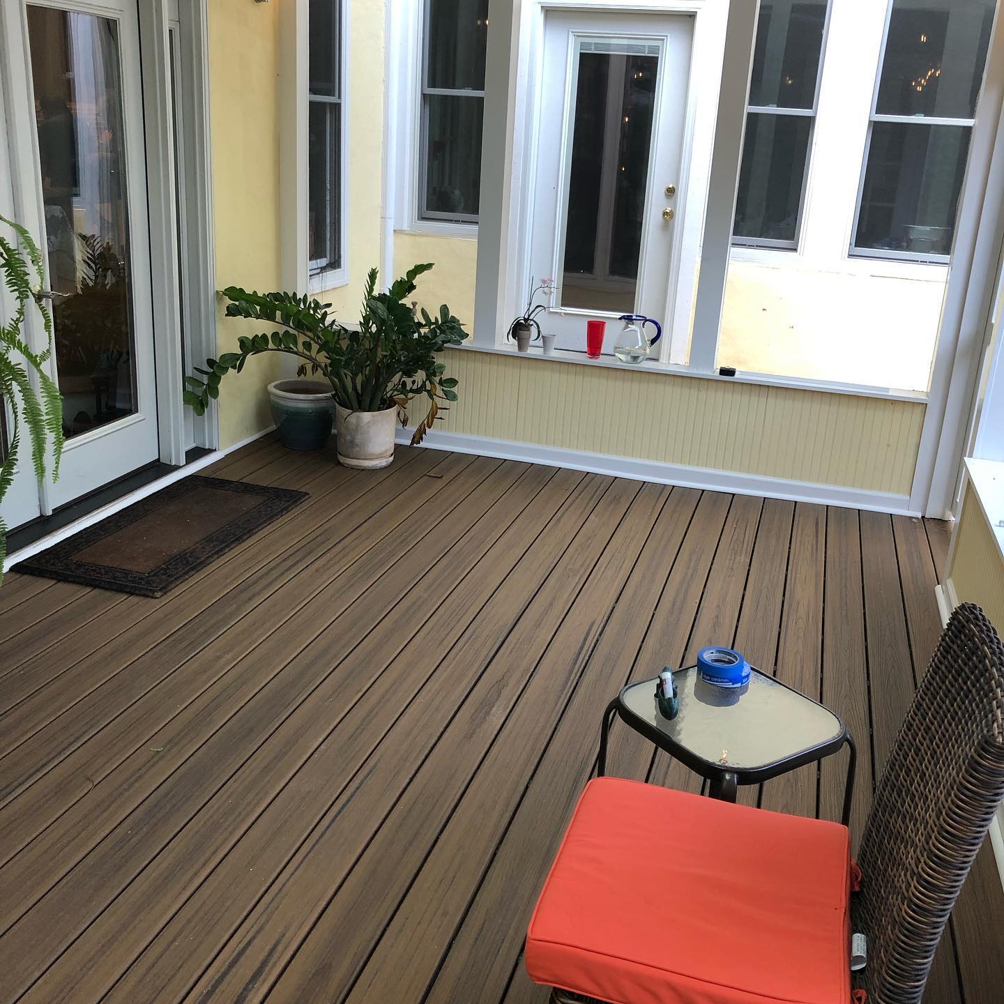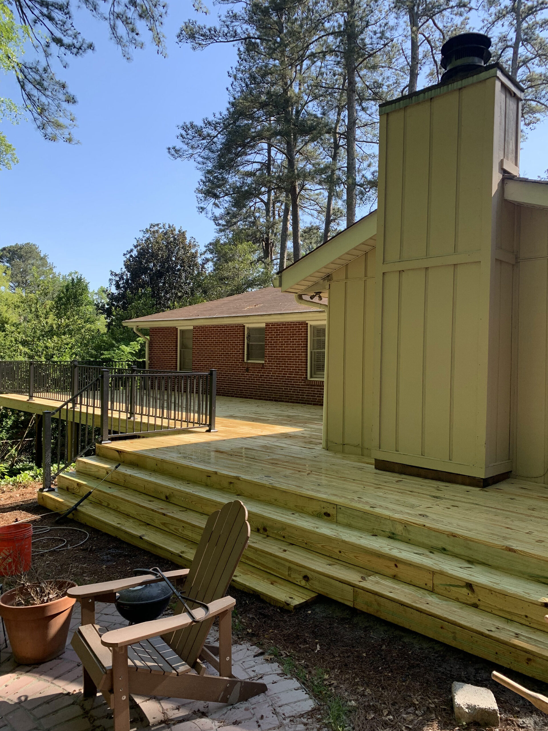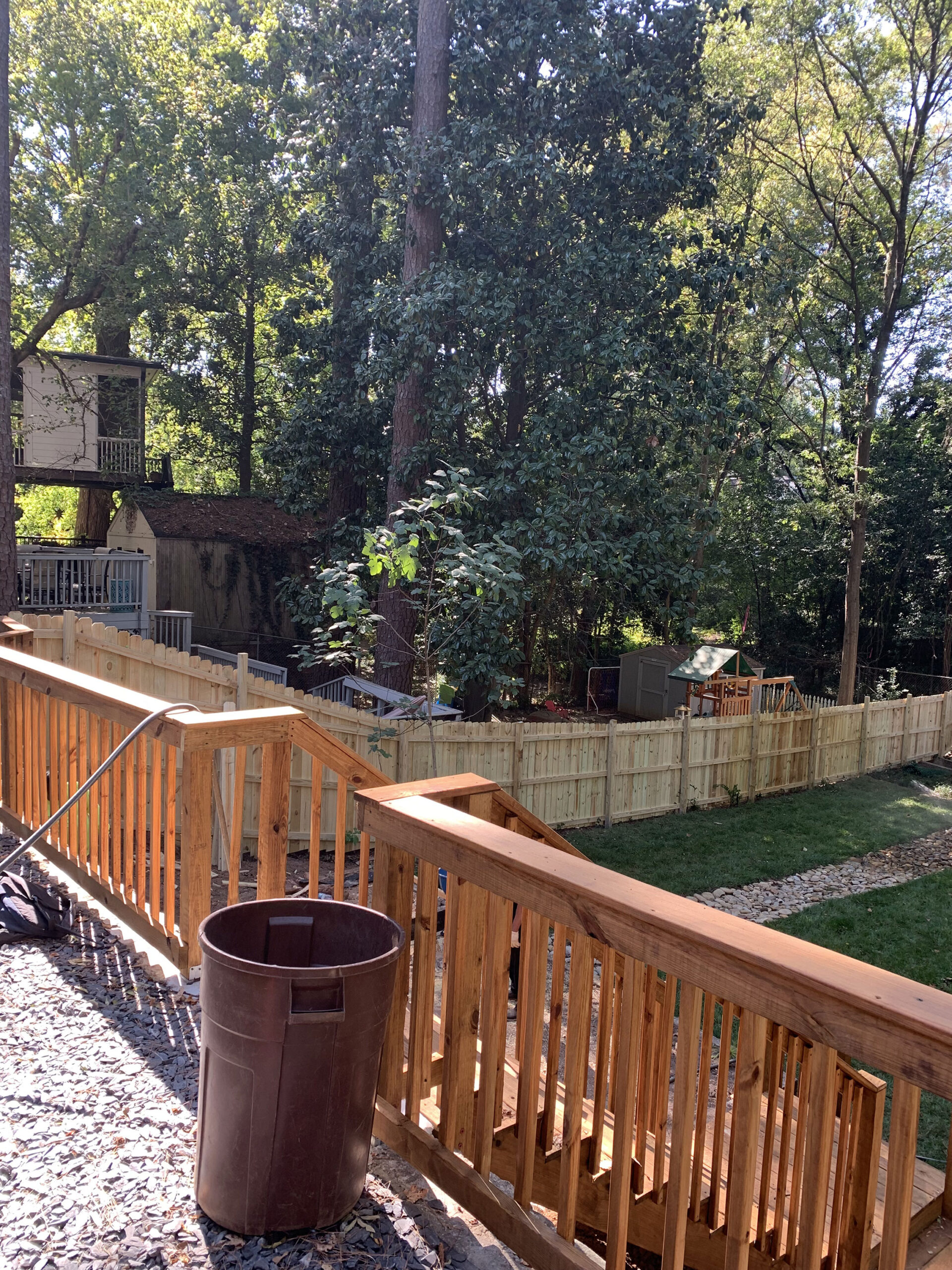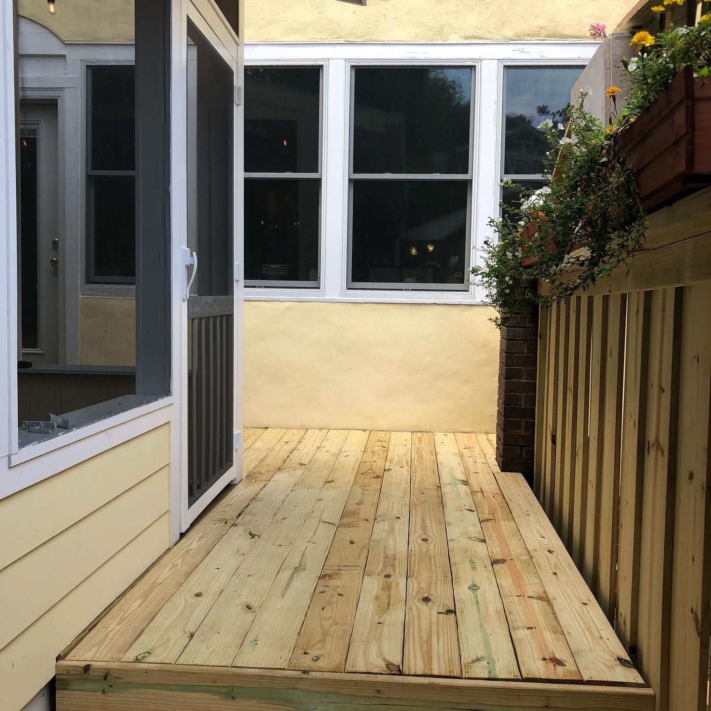 Fully rebuilt this sagging deck, added about 70+ sq ft, removed a hot tub, and installed Trex composite decking in Havana Gold with concealed fasteners in the porch. Also removed a massive treehouse to make way for some awesome landscaping coming soon. 40 cubic yards of waste hauled off. The old decking was made of 2×6, and the screened porch was built on top of the old deck. Because new decking is thinner, the entire project needed to be raised 0.5” to maintain consistent dimensions throughout the outdoor space of 800 square feet. No trip hazards, plus new porch doors with hardware. New steps, landing, expanded walkway. Completed ahead of schedule, and on budget!