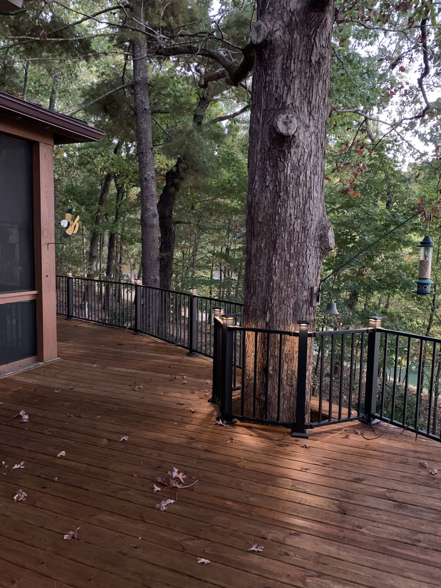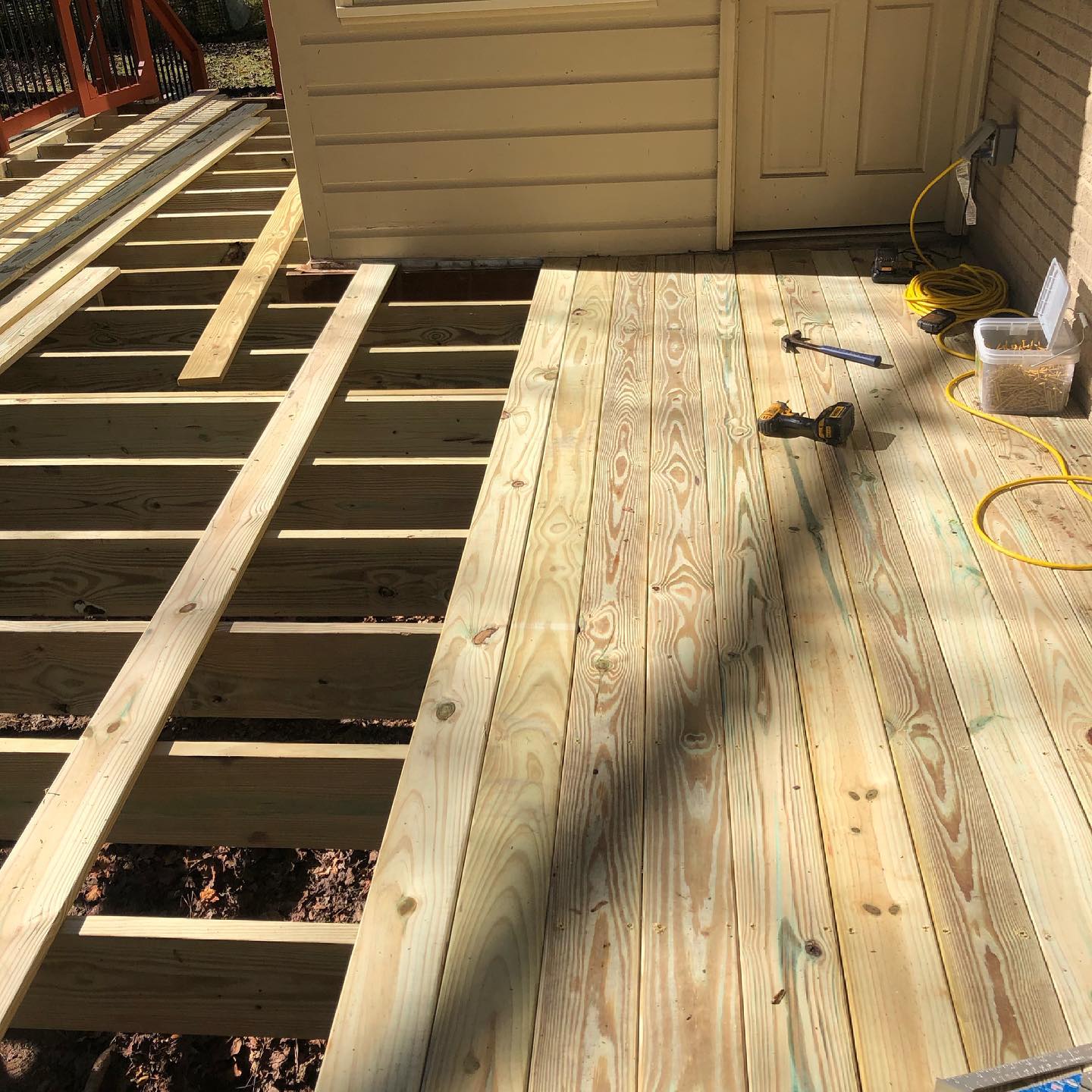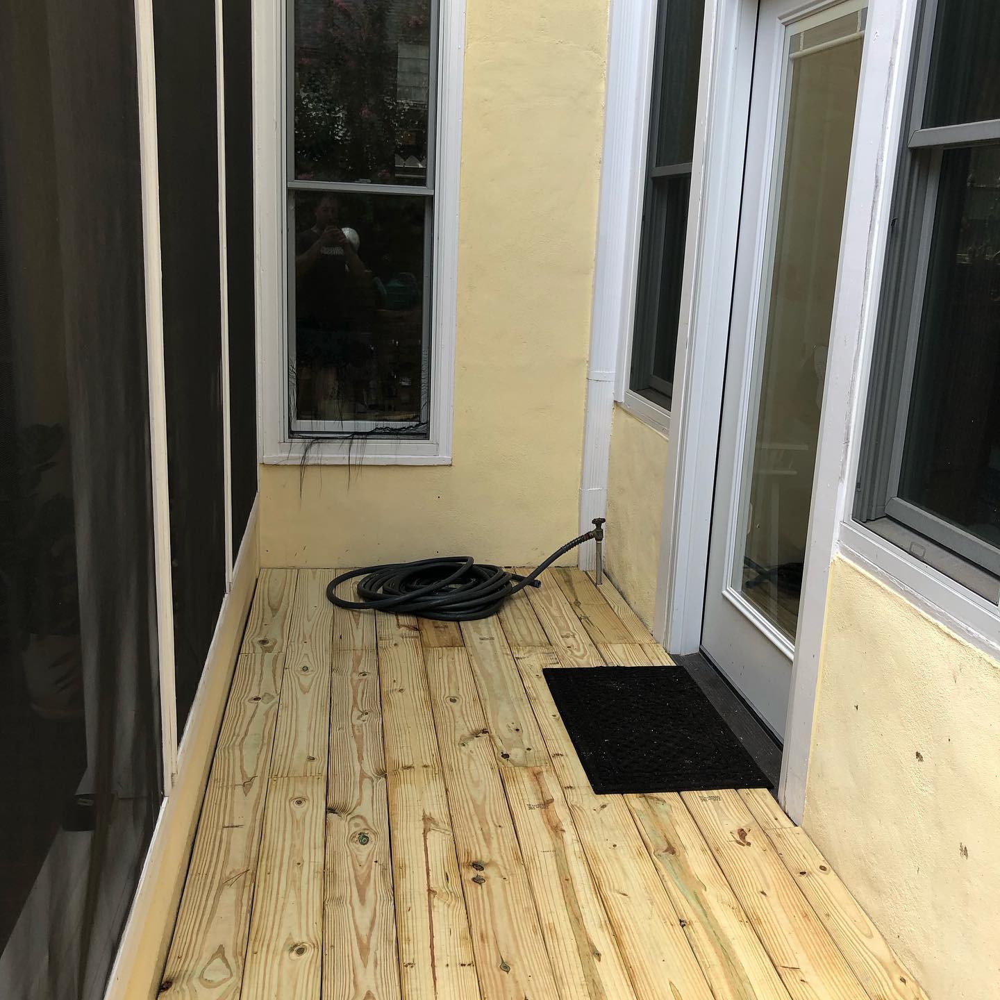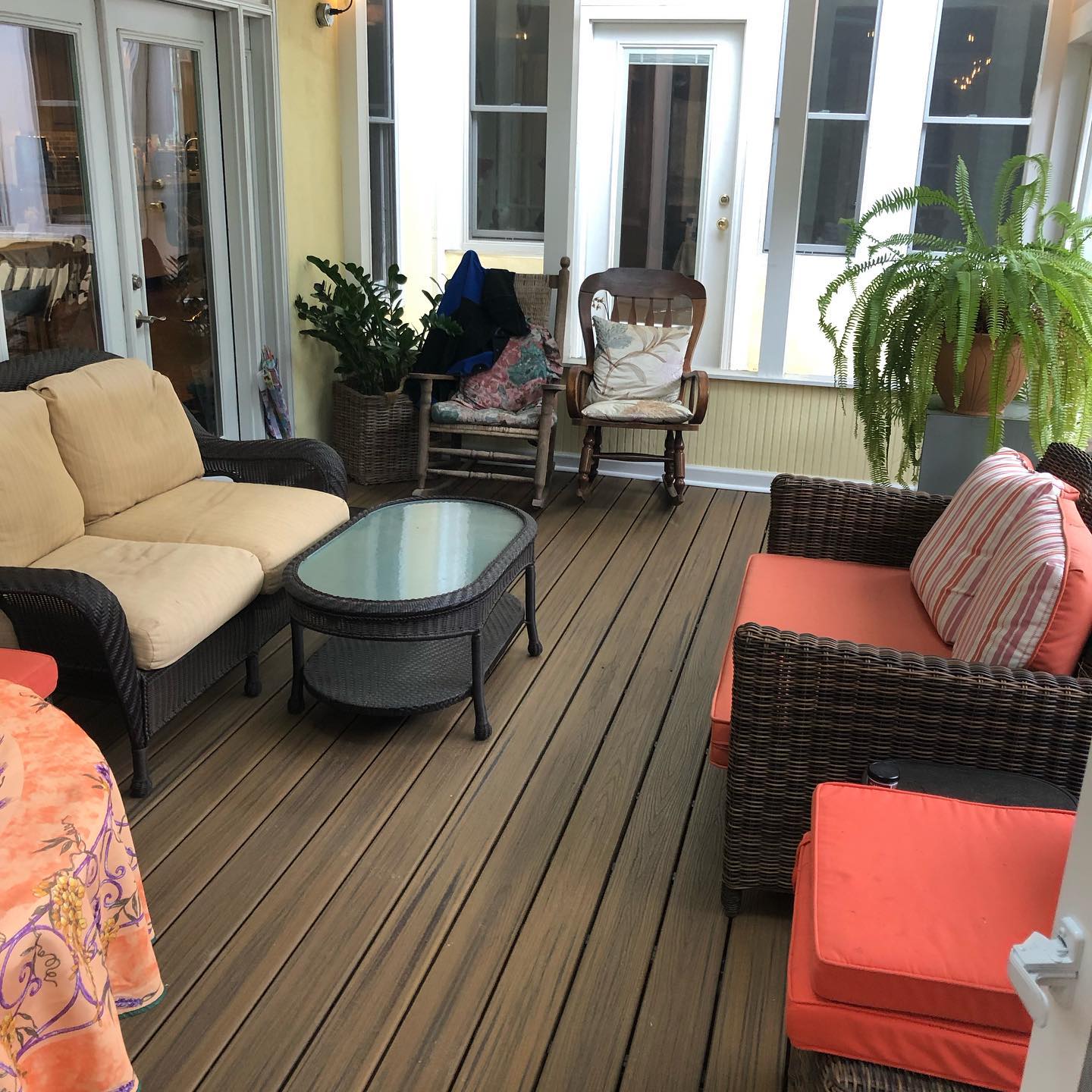 Fully rebuilt this sagging deck, added about 70+ sq ft, removed a hot tub, and installed Trex composite decking in Havana Gold with concealed fasteners in the porch. Also removed a massive treehouse to make way for some awesome landscaping coming soon. 40 cubic yards of waste hauled off. The old decking was made of 2×6, and the screened porch was built on top of the old deck. Because new decking is thinner, the entire project needed to be raised 0.5” to maintain consistent dimensions throughout the outdoor space of 800 square feet. No trip hazards, plus new porch doors with hardware. New steps, landing, expanded walkway. Completed ahead of schedule, and on budget!