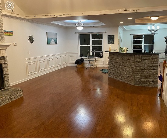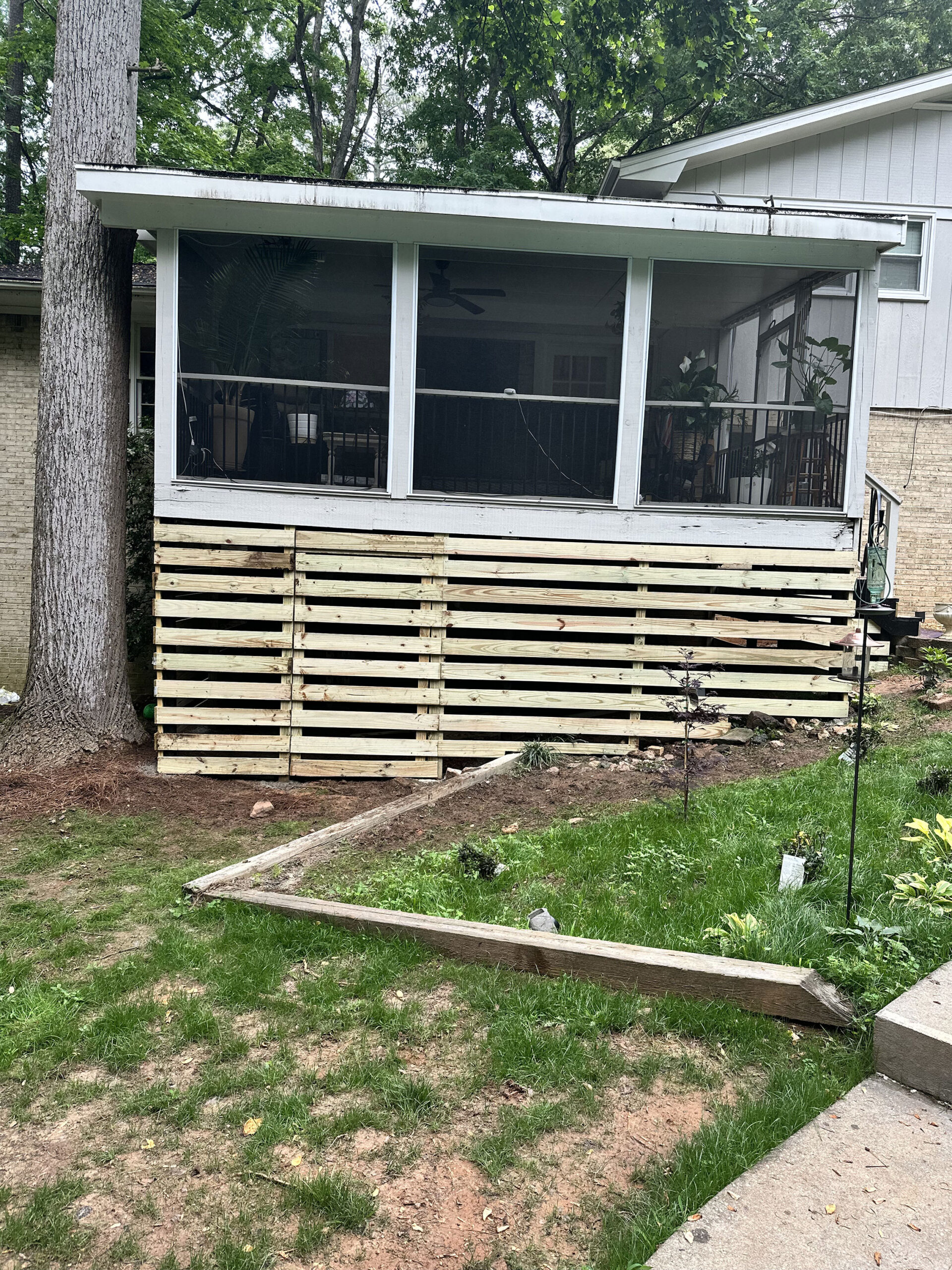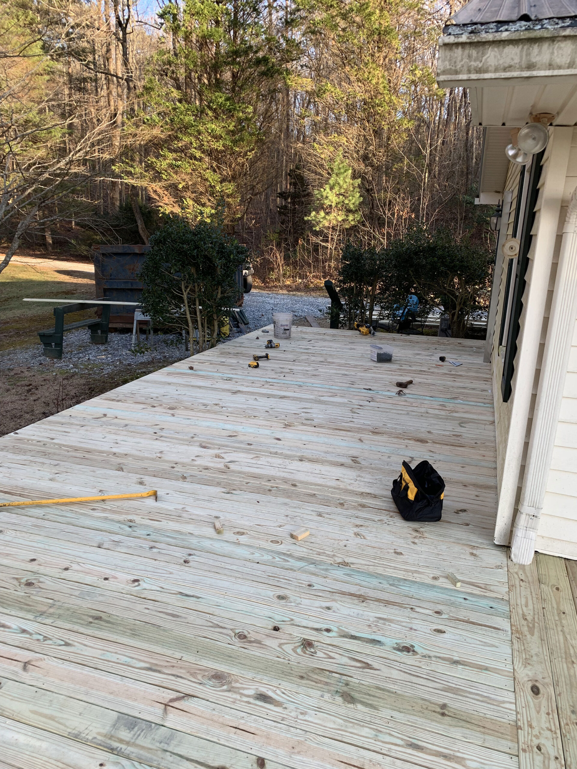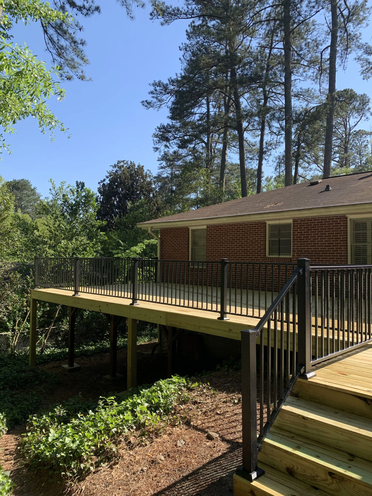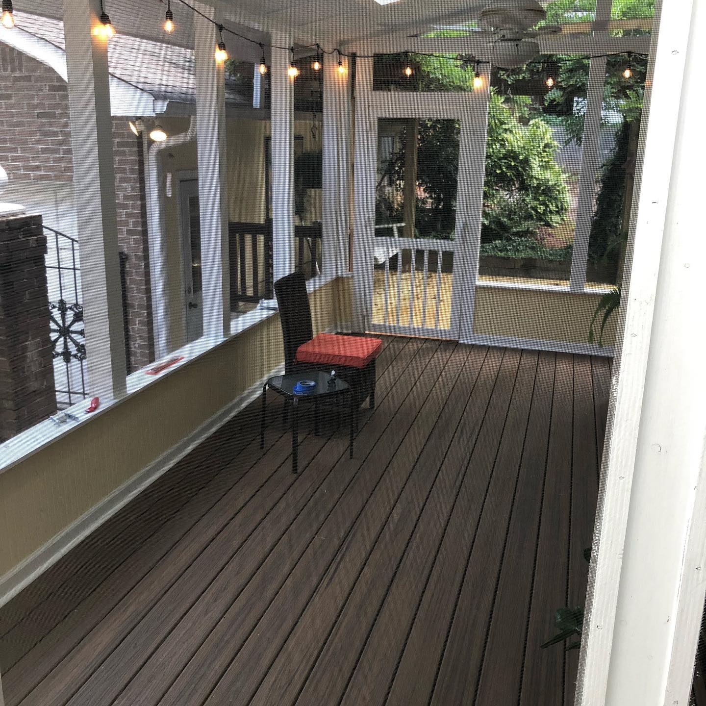 Fully rebuilt this sagging deck, added about 70+ sq ft, removed a hot tub, and installed Trex composite decking in Havana Gold with concealed fasteners in the porch. Also removed a massive treehouse to make way for some awesome landscaping coming soon. 40 cubic yards of waste hauled off. The old decking was made of 2×6, and the screened porch was built on top of the old deck. Because new decking is thinner, the entire project needed to be raised 0.5” to maintain consistent dimensions throughout the outdoor space of 800 square feet. No trip hazards, plus new porch doors with hardware. New steps, landing, expanded walkway. Completed ahead of schedule, and on budget!
