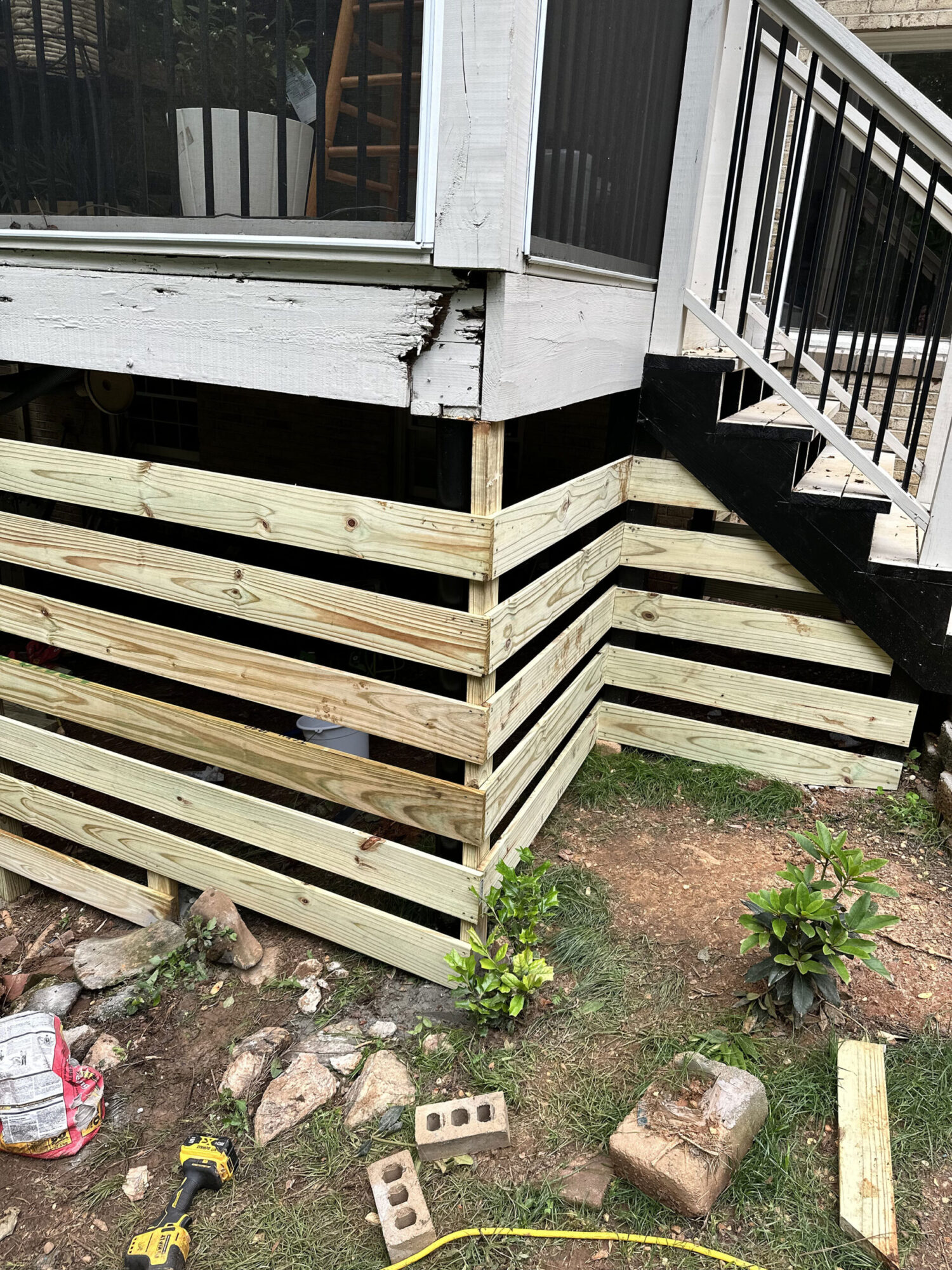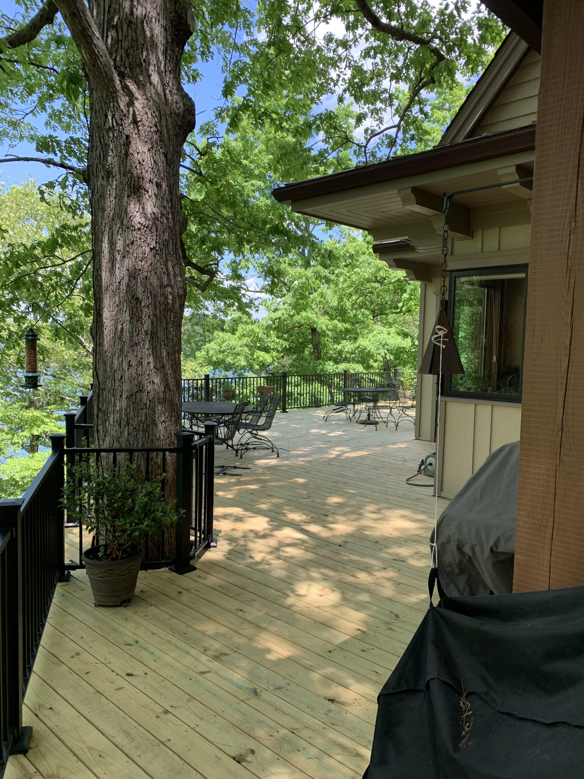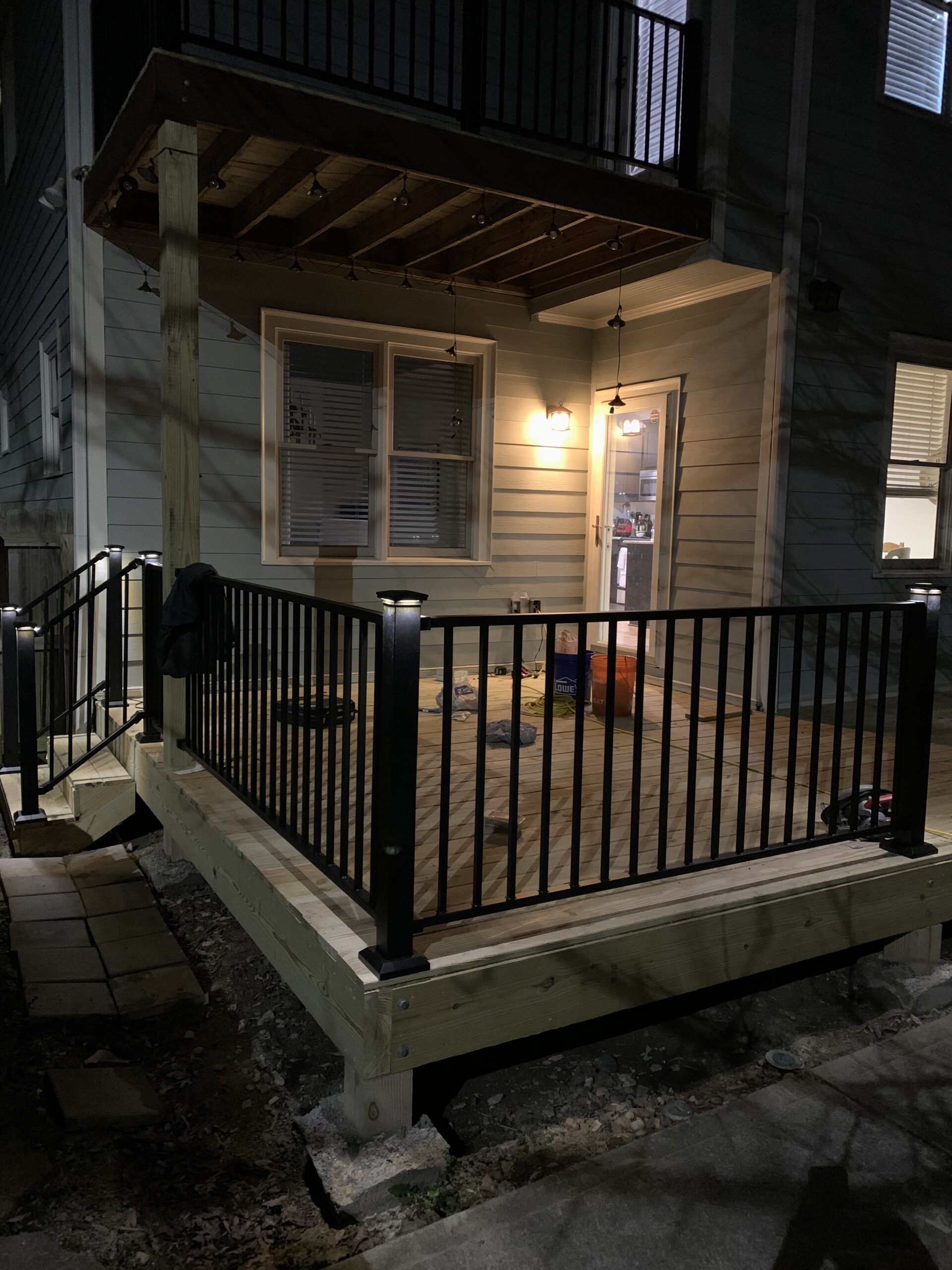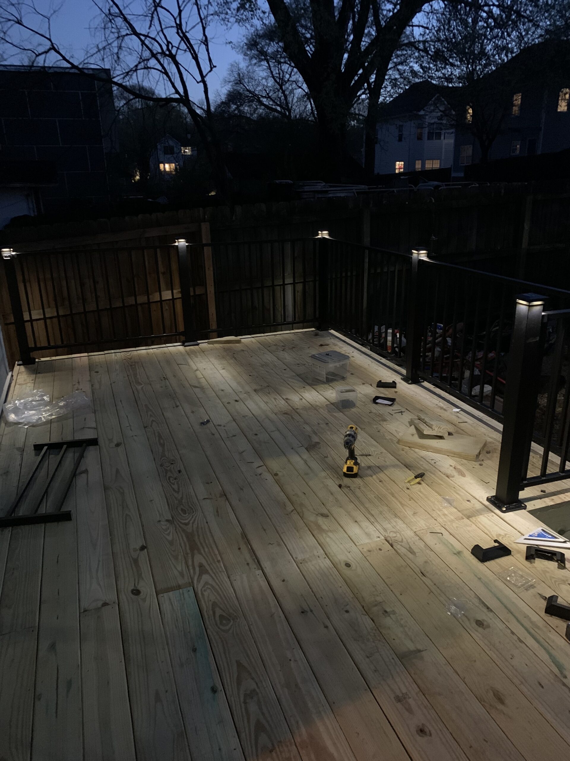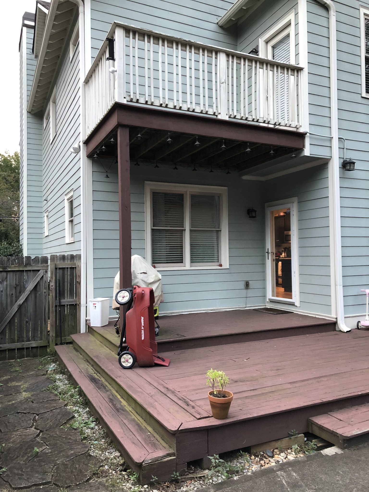 The upper deck was restored and refinished with the existing wood. Installed a new joist band (not shown) to keep it from sagging. The ground level deck was almost entirely rebuilt. What initially appeared to be some rotten deck boards soon led to the root of the problem. The structural support system was resting directly on the ground. All new joists (structural support), hangers, joist band, and new deck boards. First time using concealed fasteners which makes the deck look super clean. After a few months of curing the new wood was finely sanded smooth, and stained. Really happy with this one. Also removed the grill platform so they can watch movies and concerts on a massive 10’+ projector screen. Surround sound, string lights. Good vibes.