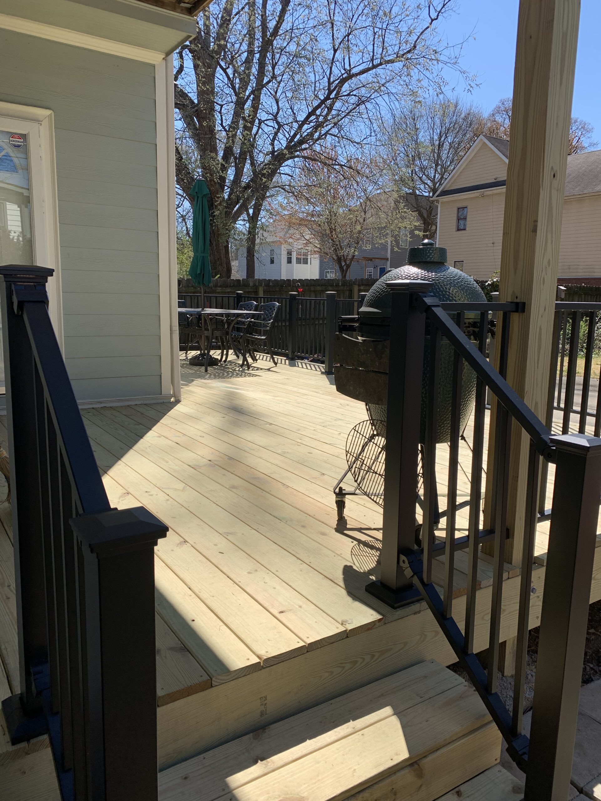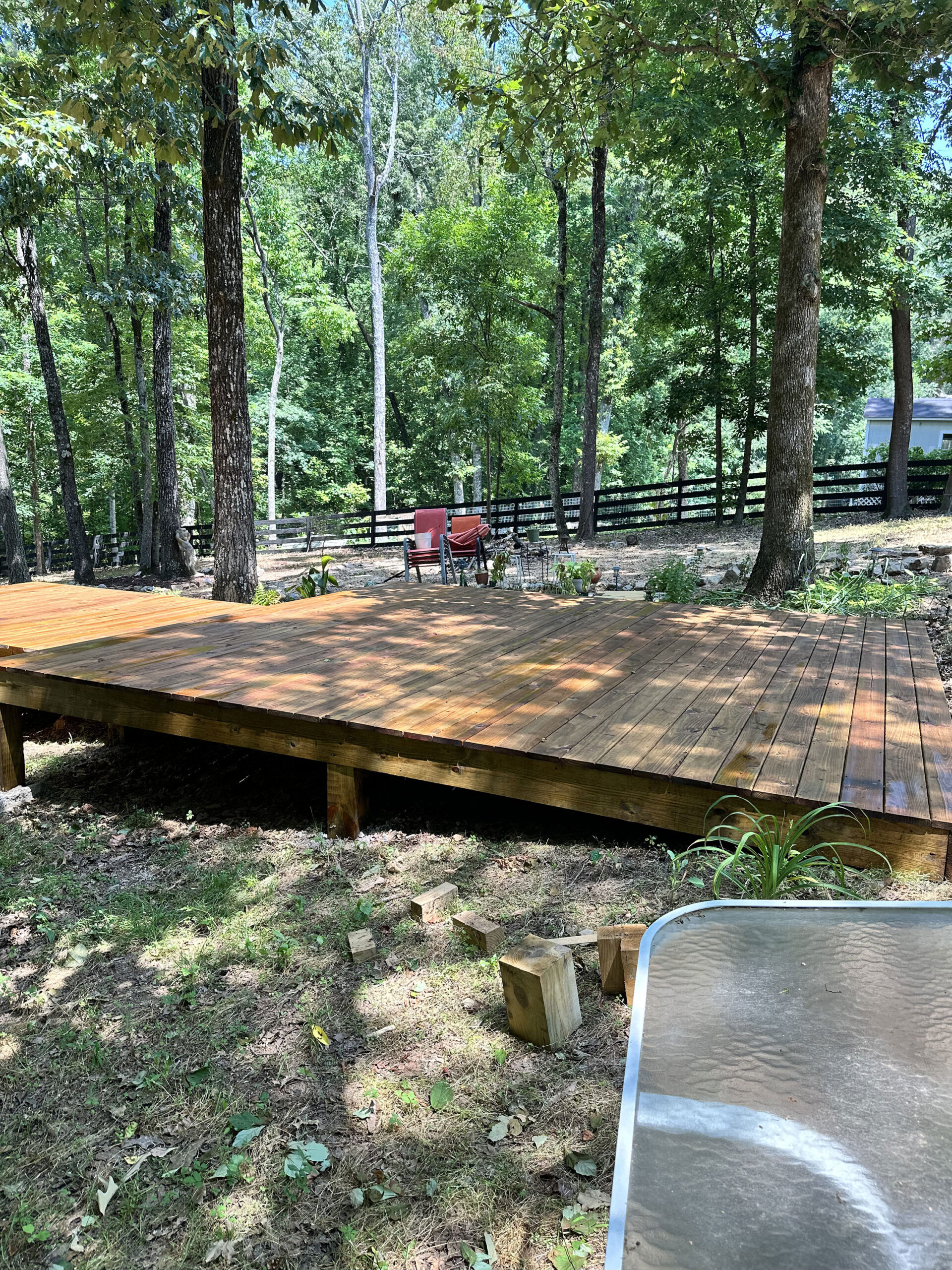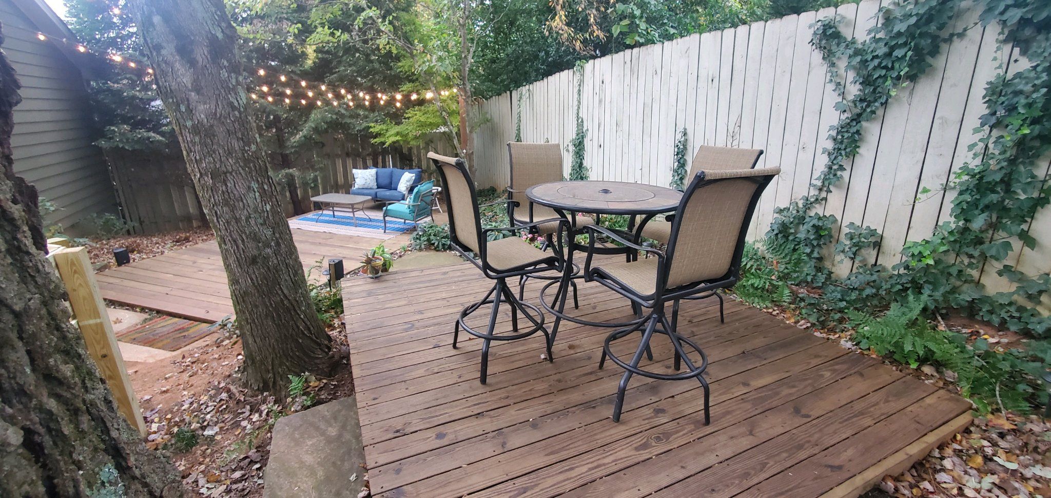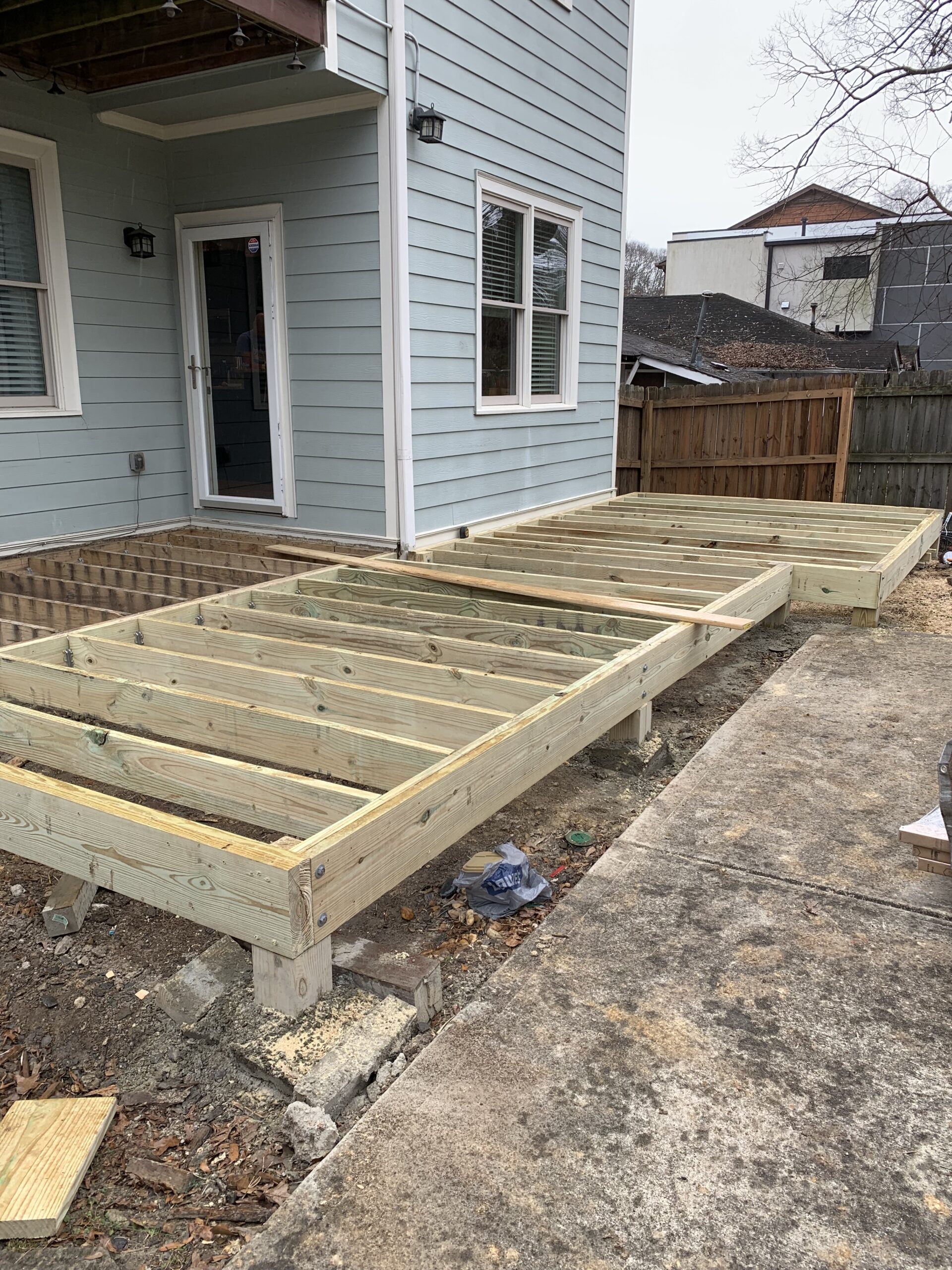 The upper deck was restored and refinished with the existing wood. Installed a new joist band (not shown) to keep it from sagging. The ground level deck was almost entirely rebuilt. What initially appeared to be some rotten deck boards soon led to the root of the problem. The structural support system was resting directly on the ground. All new joists (structural support), hangers, joist band, and new deck boards. First time using concealed fasteners which makes the deck look super clean. After a few months of curing the new wood was finely sanded smooth, and stained. Really happy with this one. Also removed the grill platform so they can watch movies and concerts on a massive 10’+ projector screen. Surround sound, string lights. Good vibes.