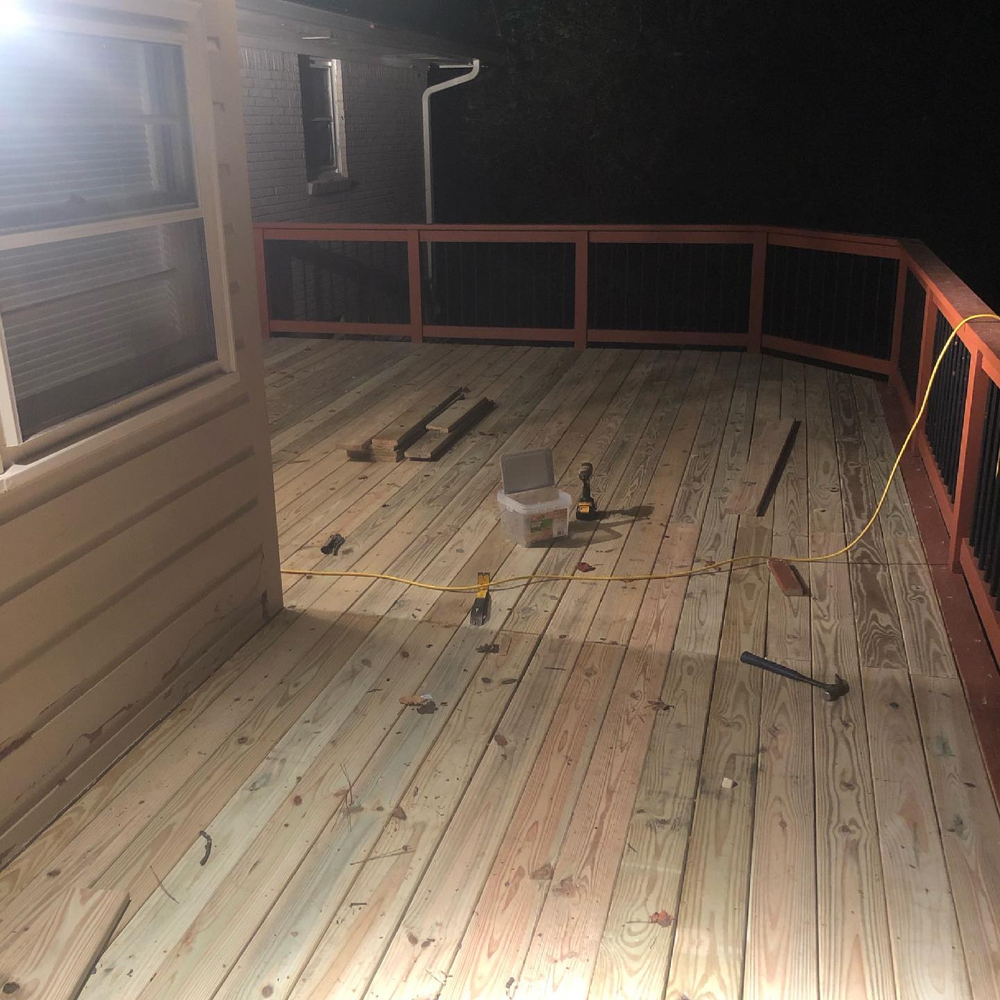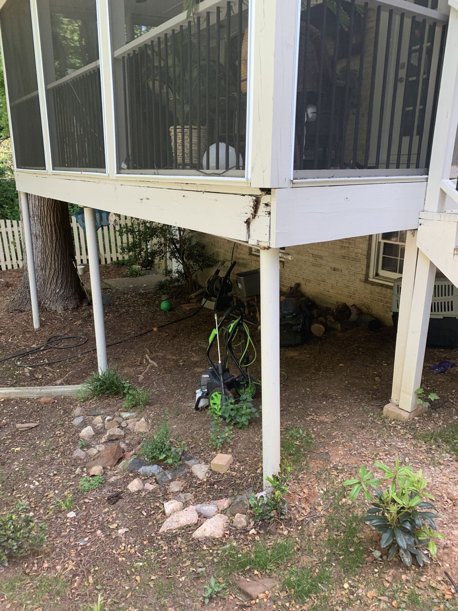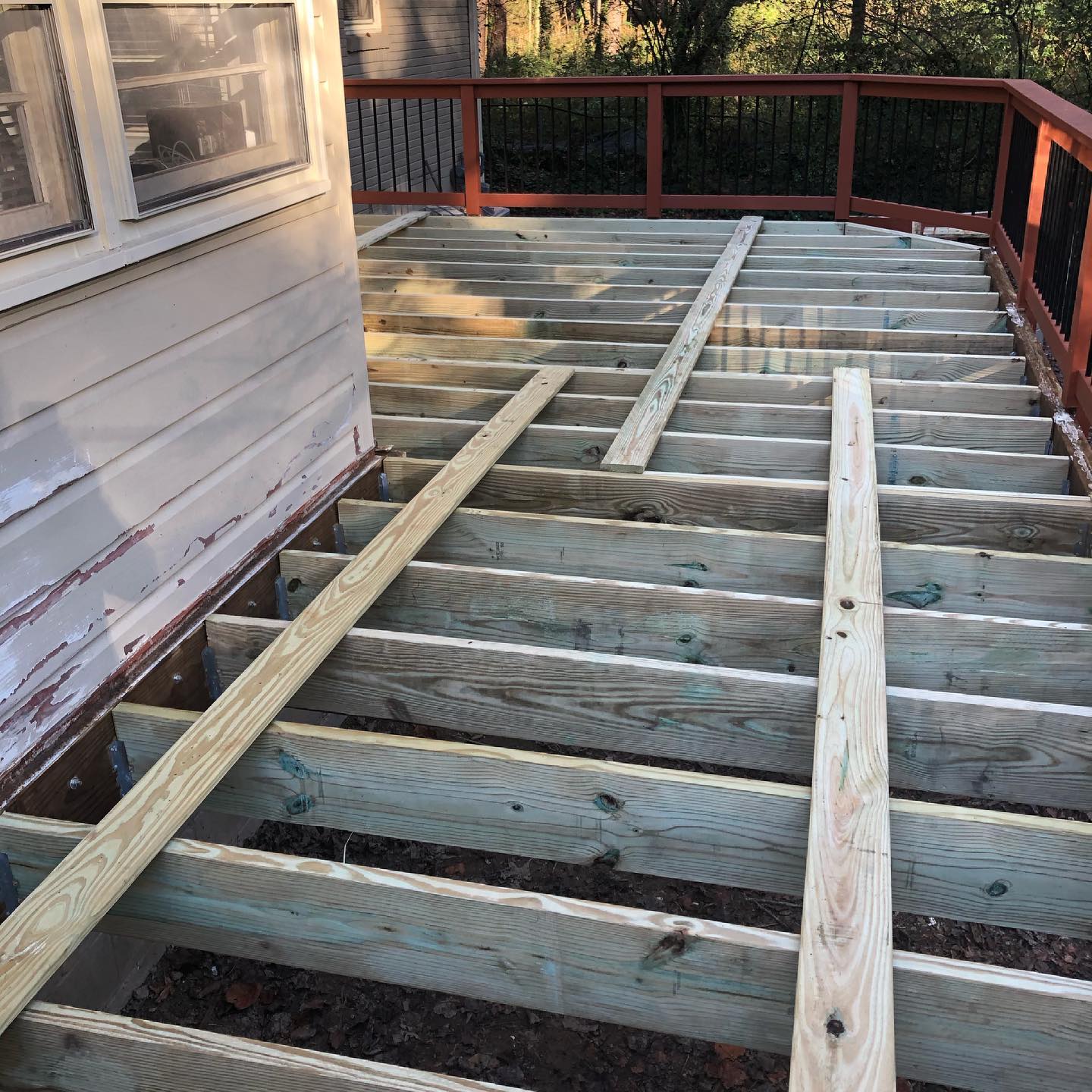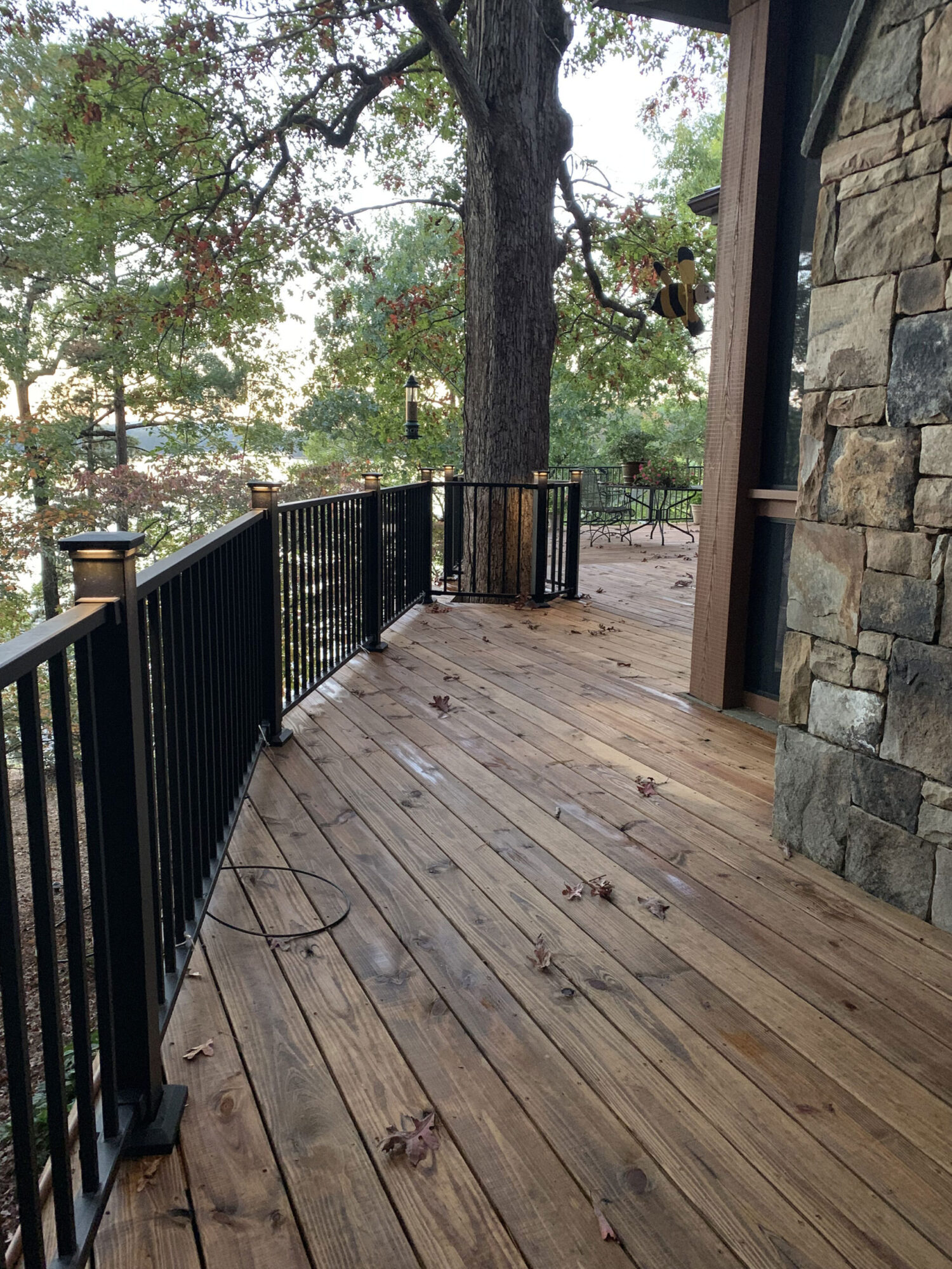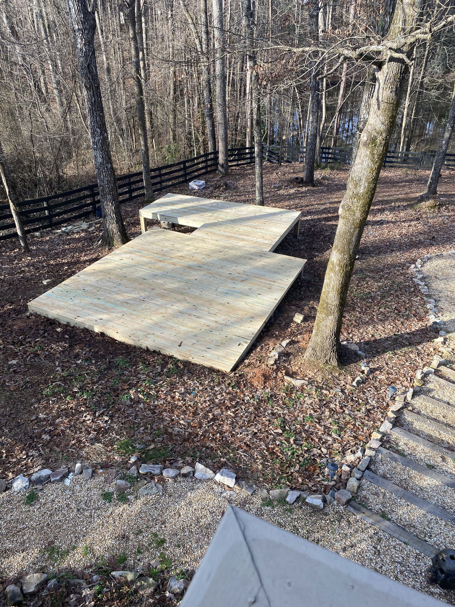 The upper deck was restored and refinished with the existing wood. Installed a new joist band (not shown) to keep it from sagging. The ground level deck was almost entirely rebuilt. What initially appeared to be some rotten deck boards soon led to the root of the problem. The structural support system was resting directly on the ground. All new joists (structural support), hangers, joist band, and new deck boards. First time using concealed fasteners which makes the deck look super clean. After a few months of curing the new wood was finely sanded smooth, and stained. Really happy with this one. Also removed the grill platform so they can watch movies and concerts on a massive 10’+ projector screen. Surround sound, string lights. Good vibes.