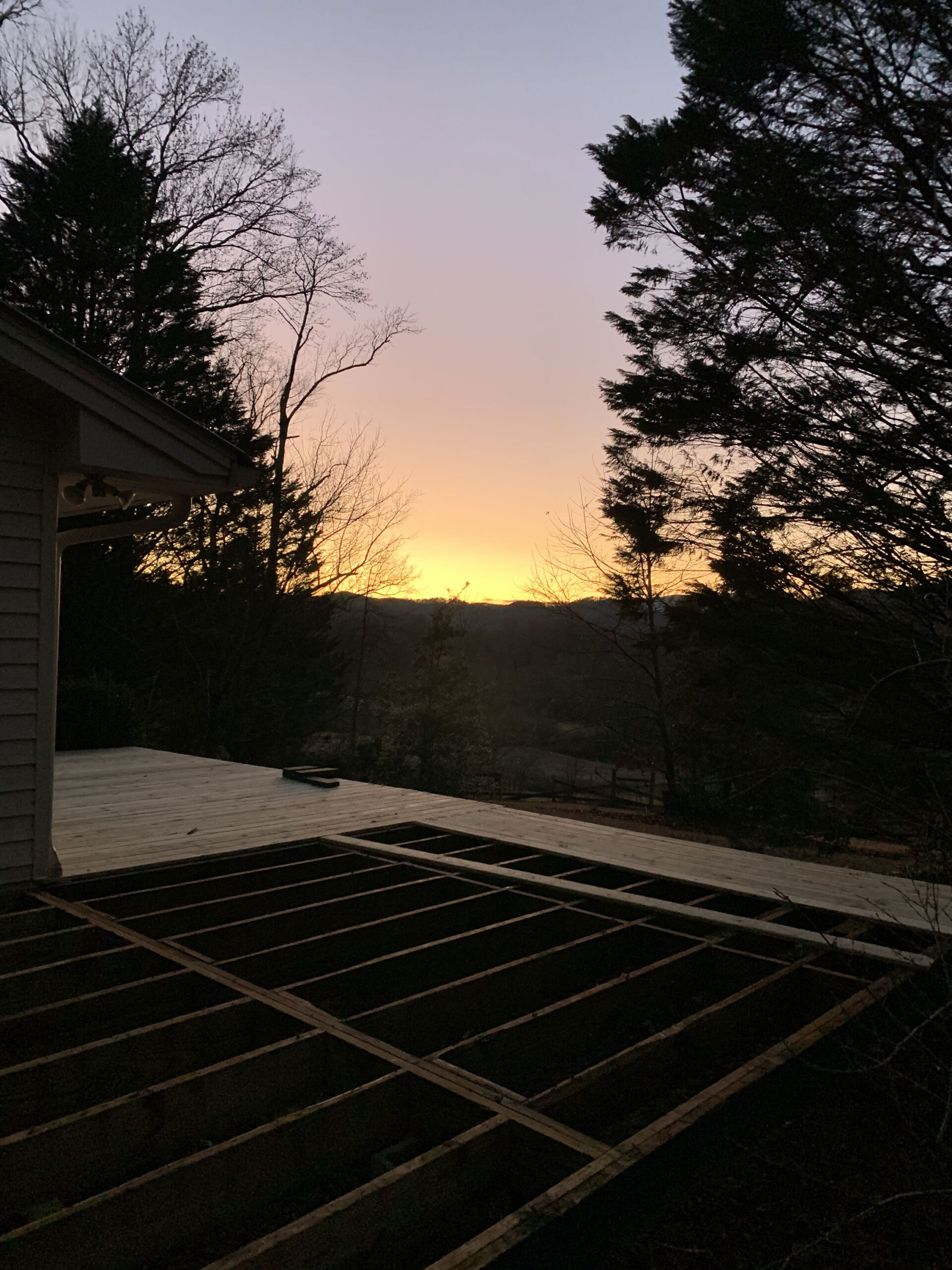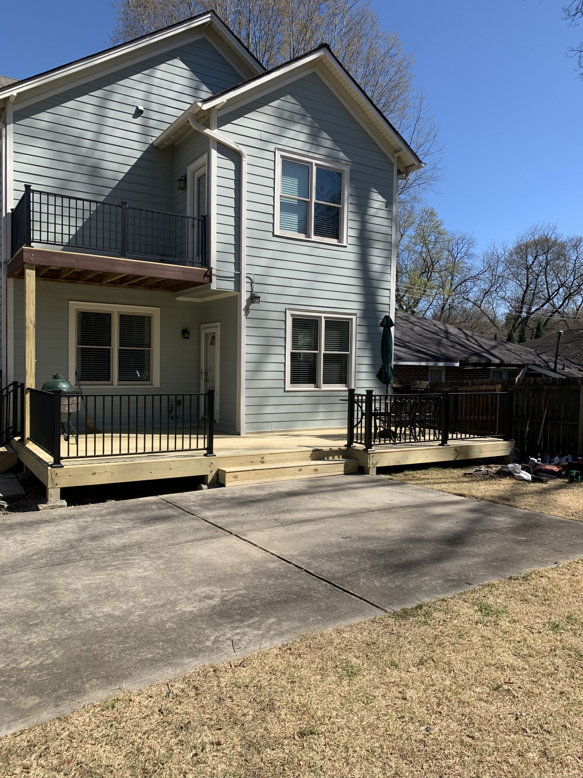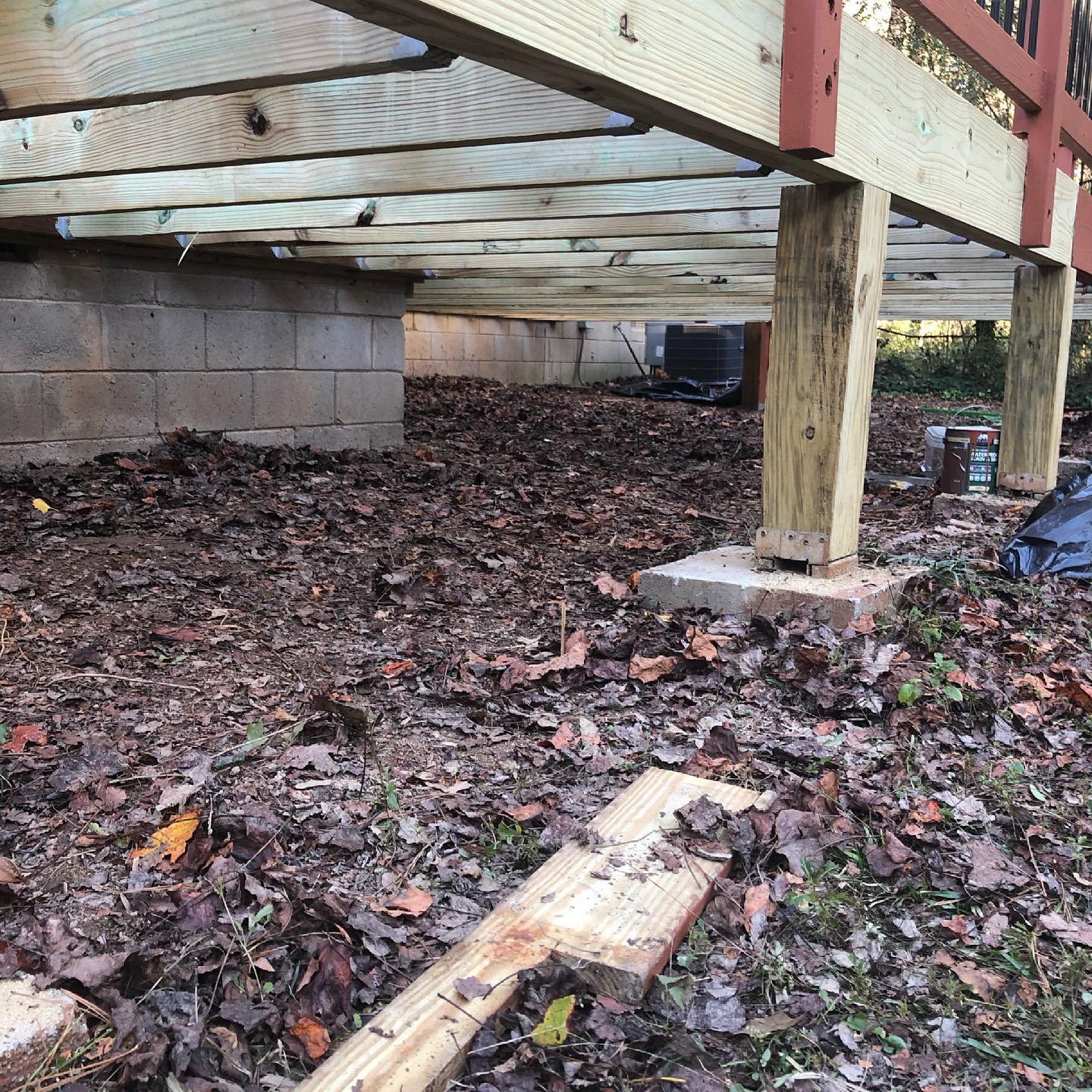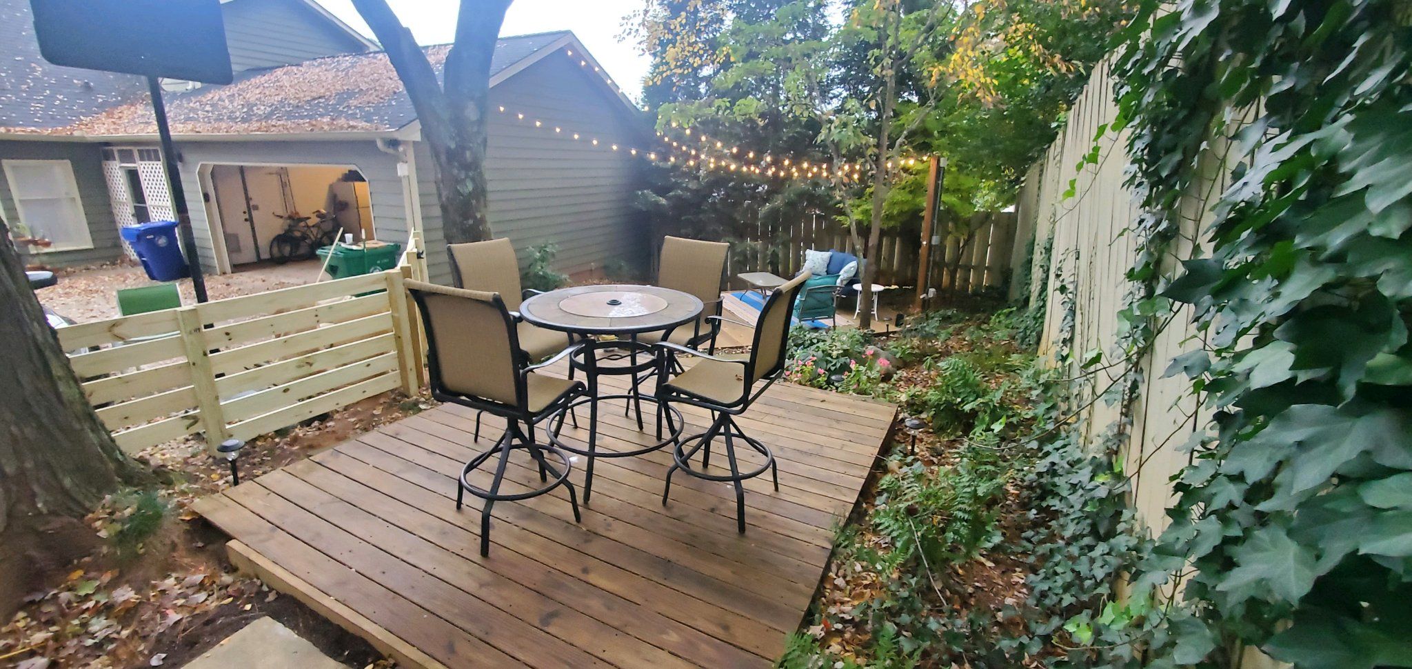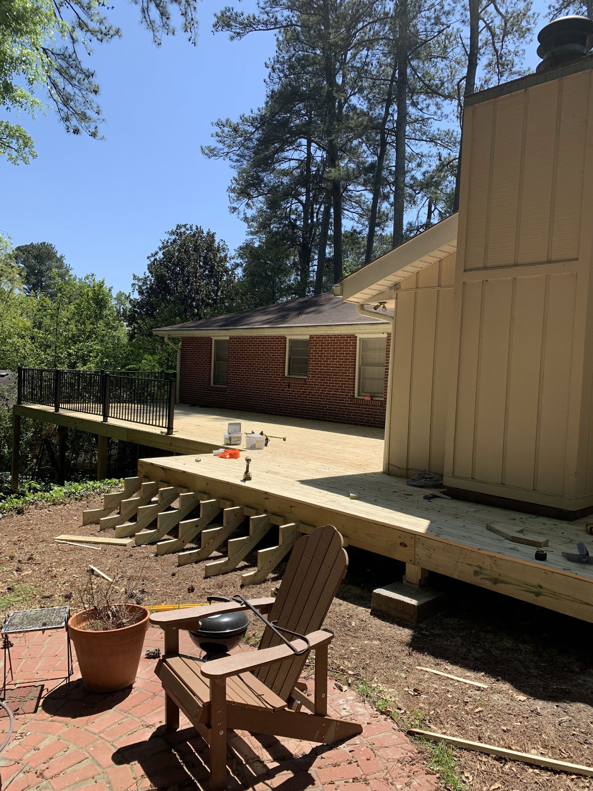 The upper deck was restored and refinished with the existing wood. Installed a new joist band (not shown) to keep it from sagging. The ground level deck was almost entirely rebuilt. What initially appeared to be some rotten deck boards soon led to the root of the problem. The structural support system was resting directly on the ground. All new joists (structural support), hangers, joist band, and new deck boards. First time using concealed fasteners which makes the deck look super clean. After a few months of curing the new wood was finely sanded smooth, and stained. Really happy with this one. Also removed the grill platform so they can watch movies and concerts on a massive 10’+ projector screen. Surround sound, string lights. Good vibes.