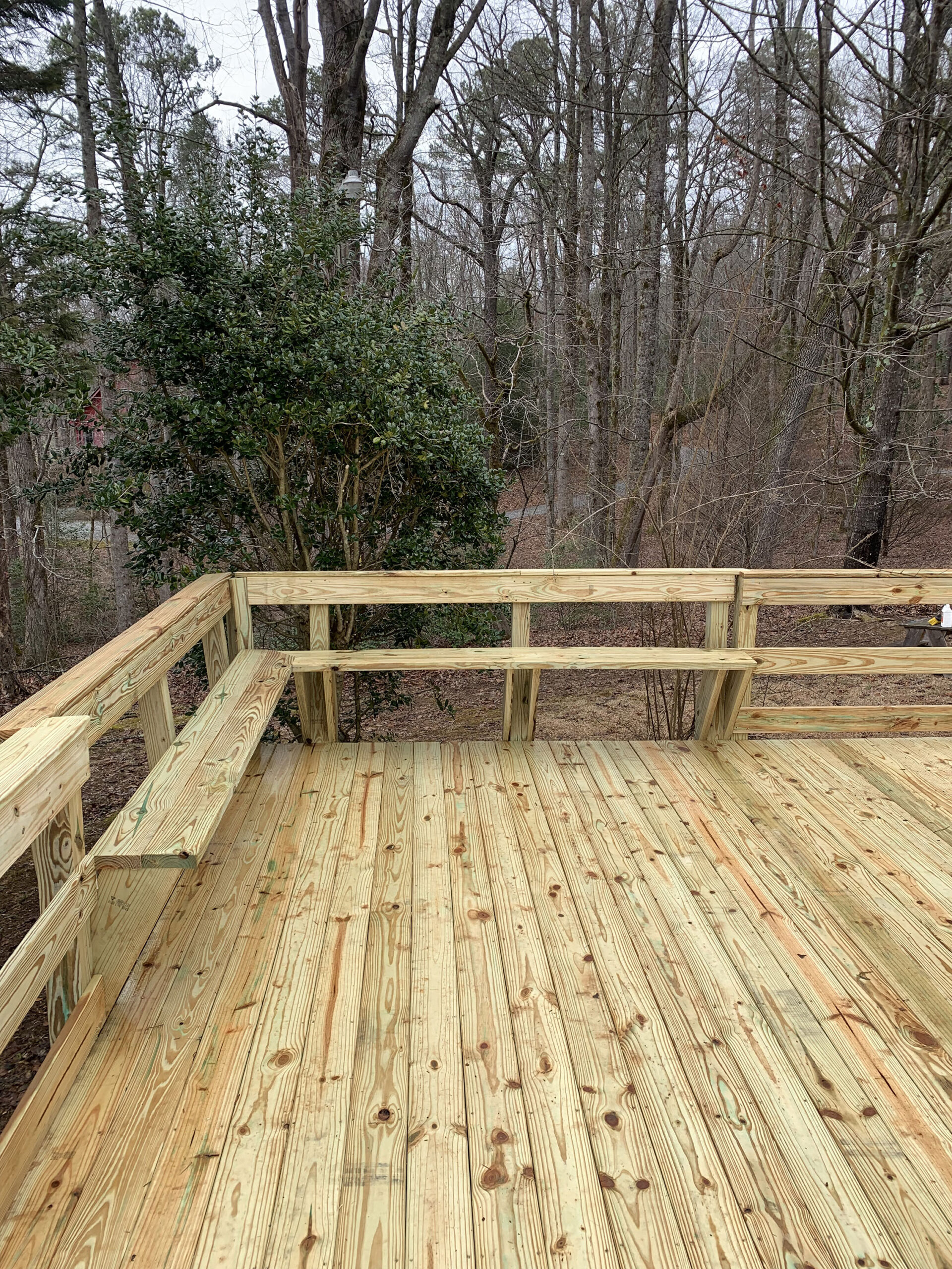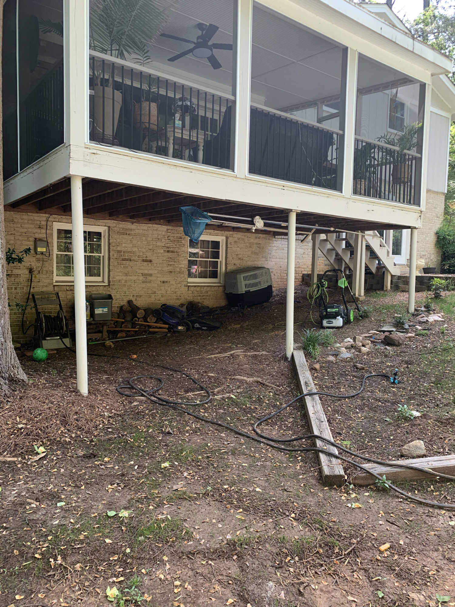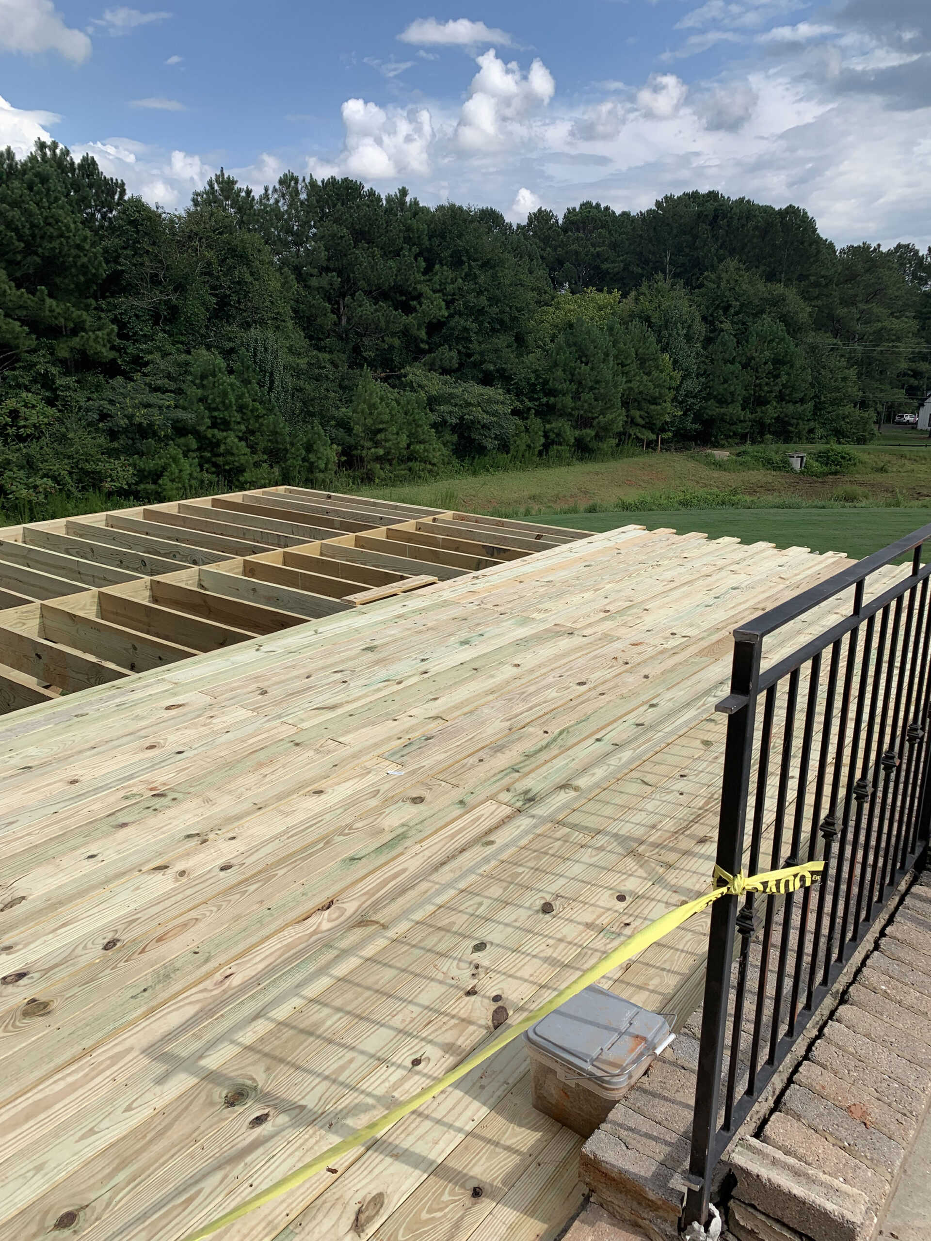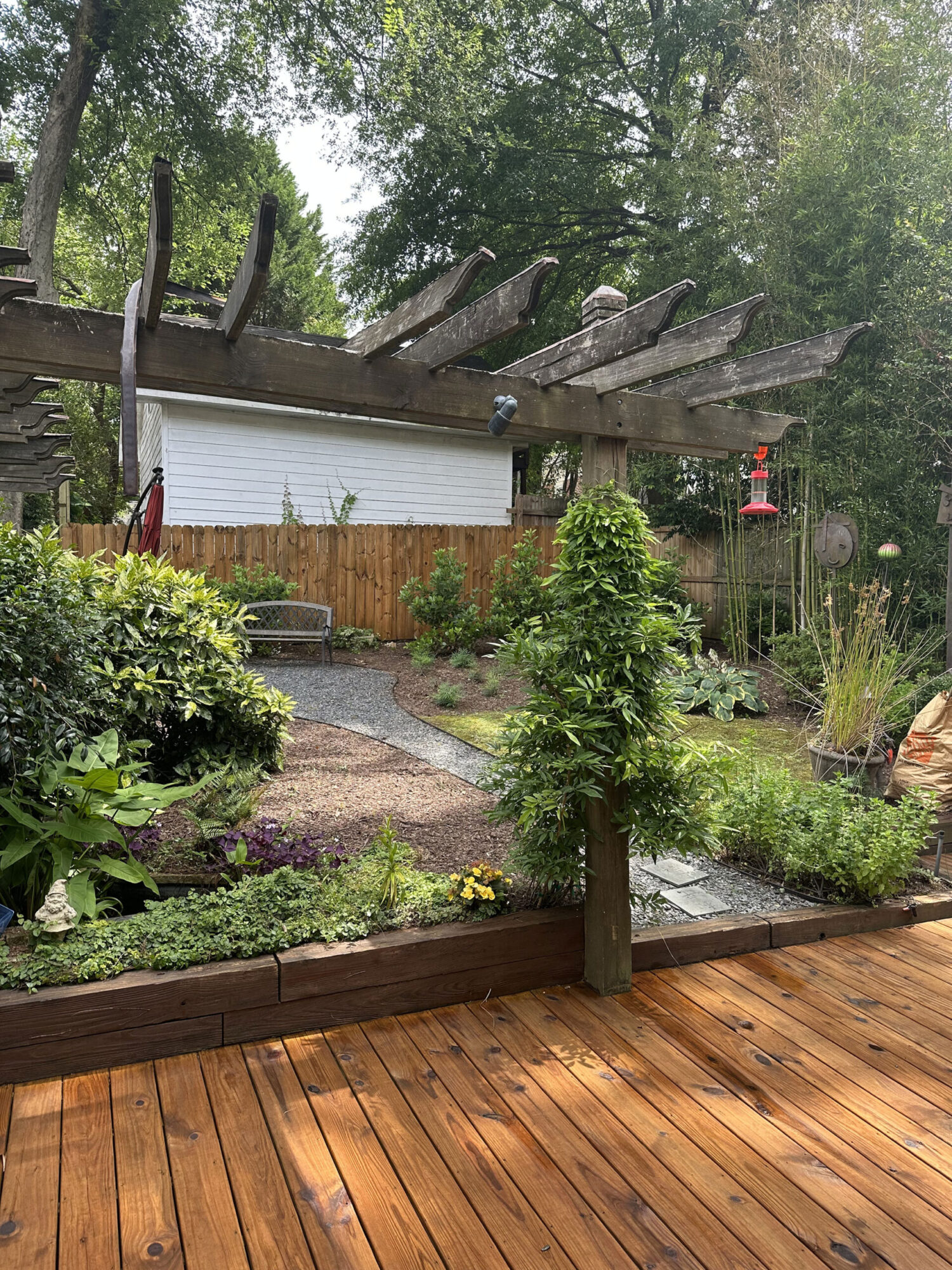 The upper deck was restored and refinished with the existing wood. Installed a new joist band (not shown) to keep it from sagging. The ground level deck was almost entirely rebuilt. What initially appeared to be some rotten deck boards soon led to the root of the problem. The structural support system was resting directly on the ground. All new joists (structural support), hangers, joist band, and new deck boards. First time using concealed fasteners which makes the deck look super clean. After a few months of curing the new wood was finely sanded smooth, and stained. Really happy with this one. Also removed the grill platform so they can watch movies and concerts on a massive 10’+ projector screen. Surround sound, string lights. Good vibes.