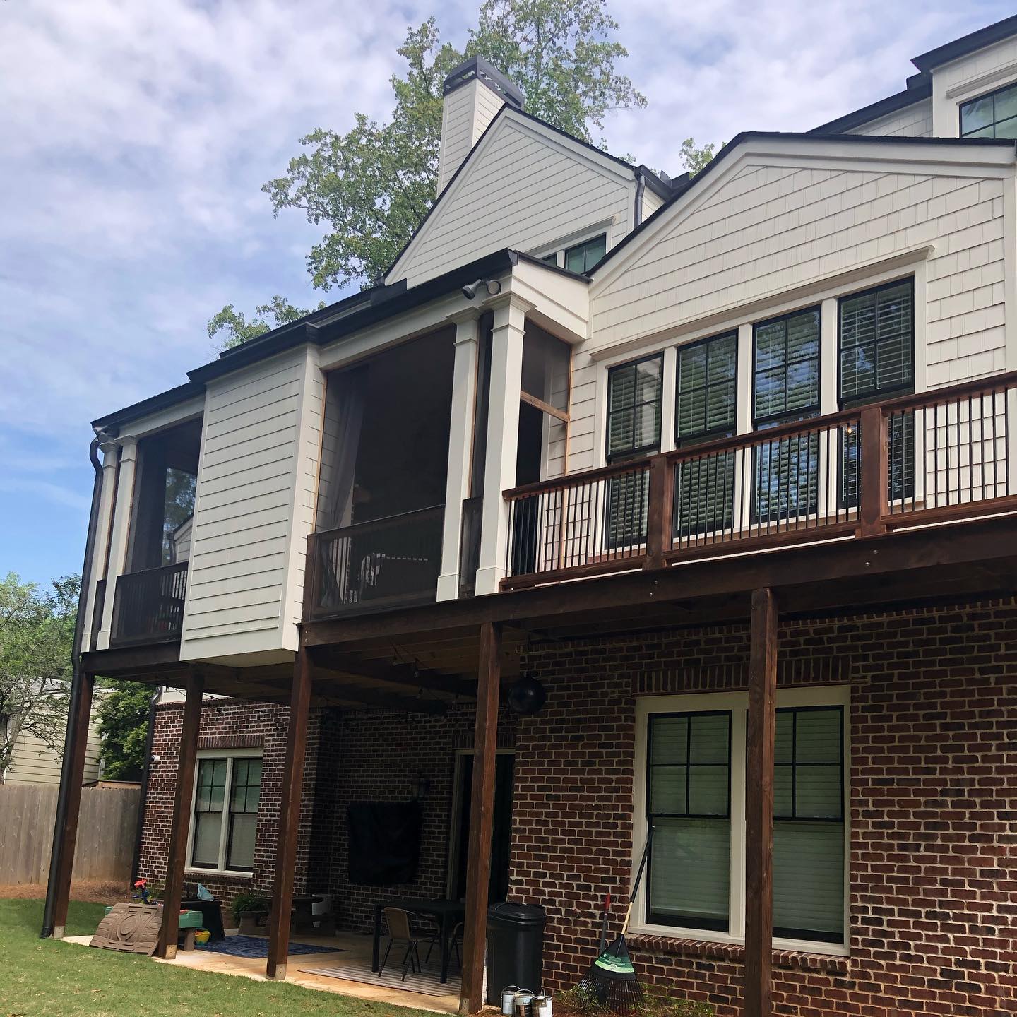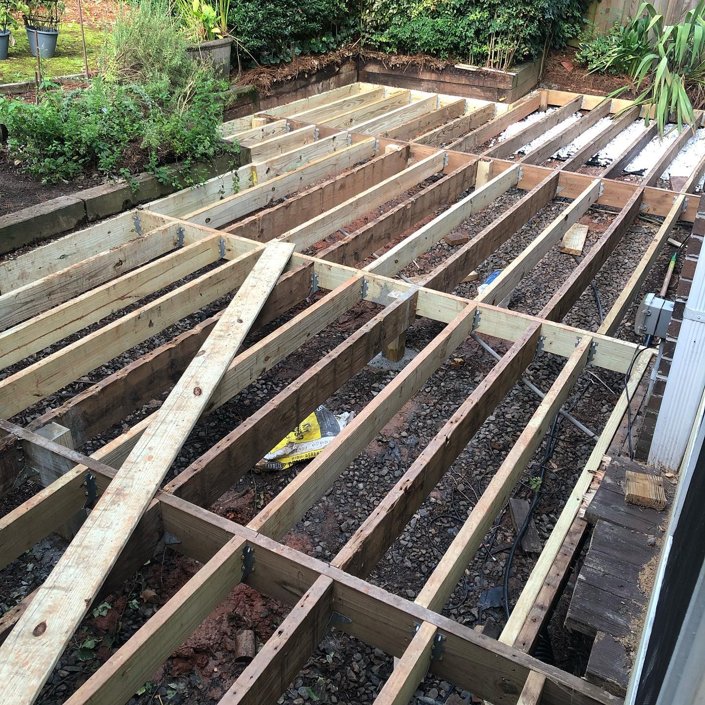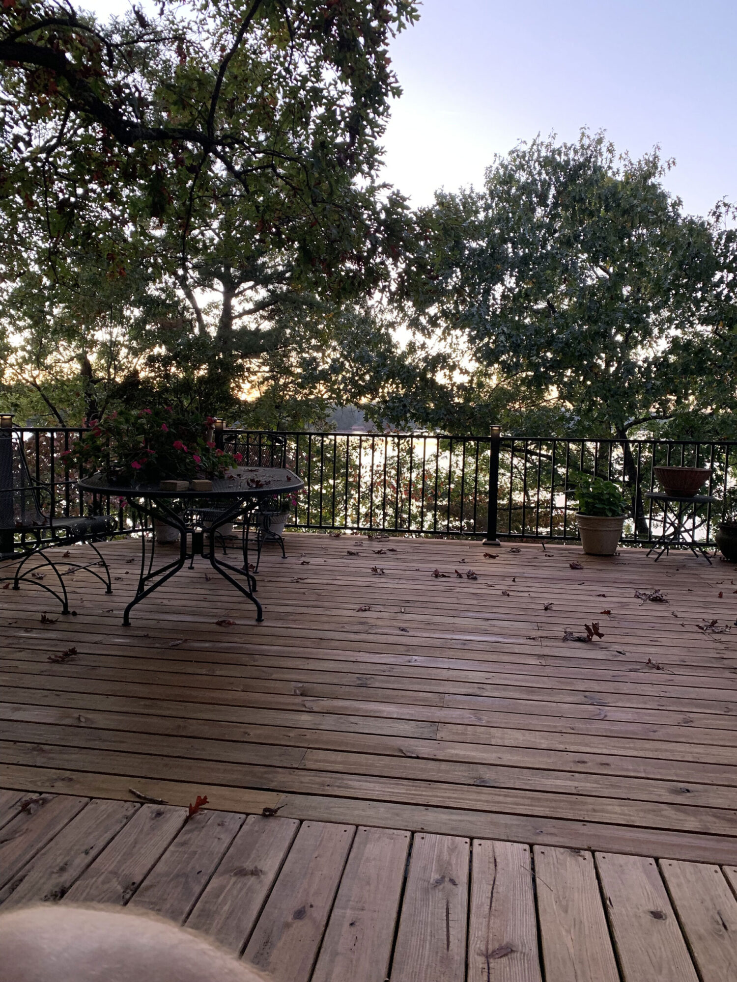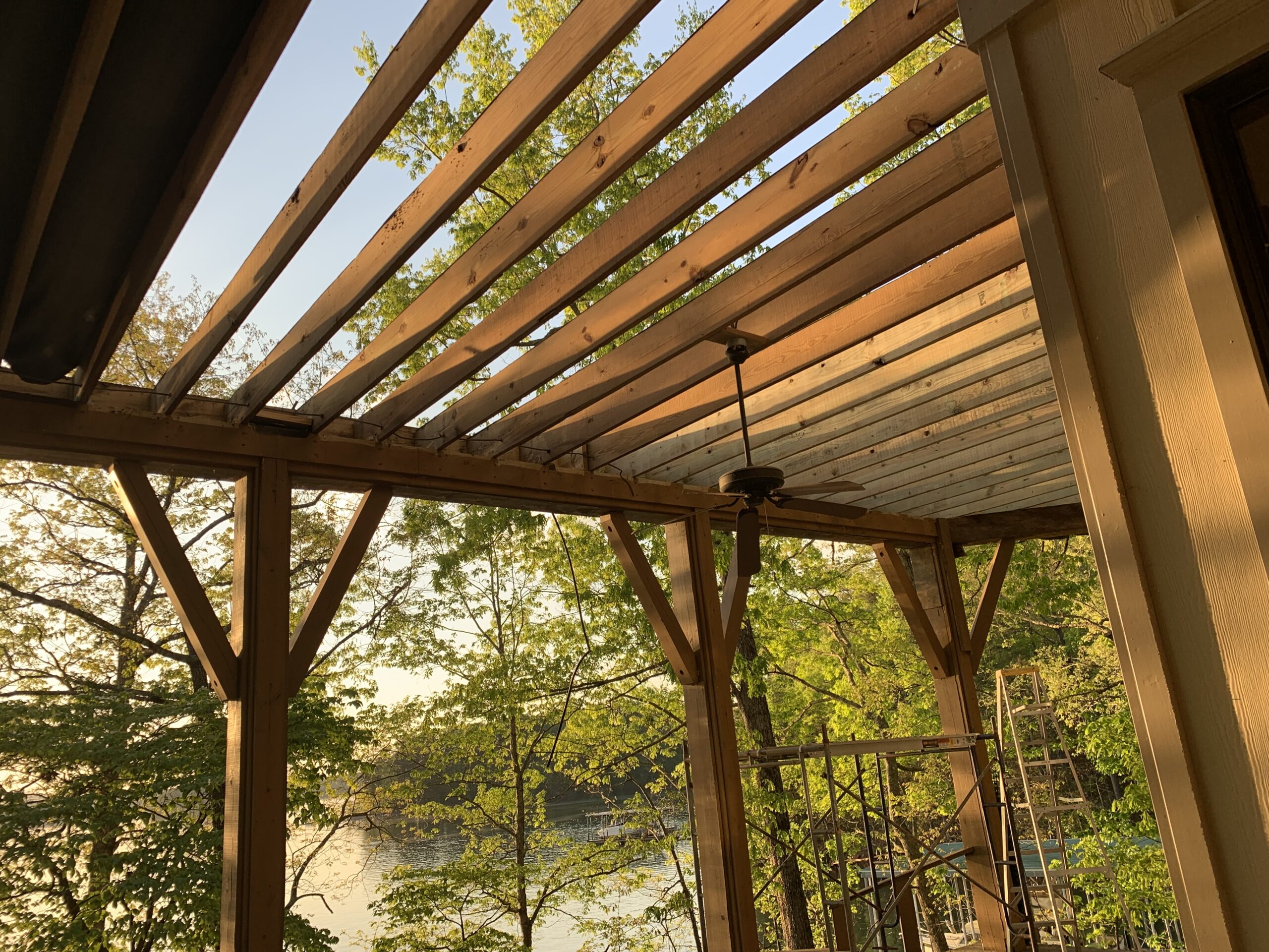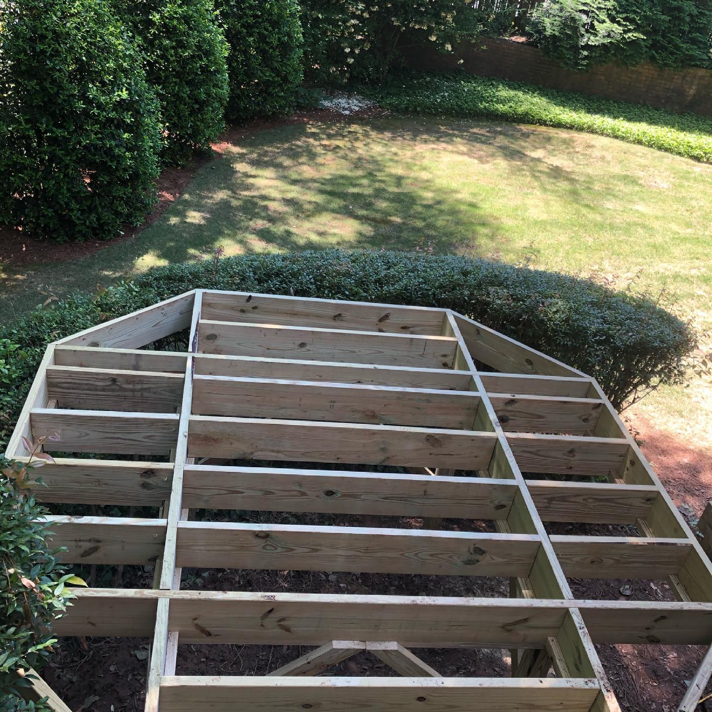 The upper deck was restored and refinished with the existing wood. Installed a new joist band (not shown) to keep it from sagging. The ground level deck was almost entirely rebuilt. What initially appeared to be some rotten deck boards soon led to the root of the problem. The structural support system was resting directly on the ground. All new joists (structural support), hangers, joist band, and new deck boards. First time using concealed fasteners which makes the deck look super clean. After a few months of curing the new wood was finely sanded smooth, and stained. Really happy with this one. Also removed the grill platform so they can watch movies and concerts on a massive 10’+ projector screen. Surround sound, string lights. Good vibes.