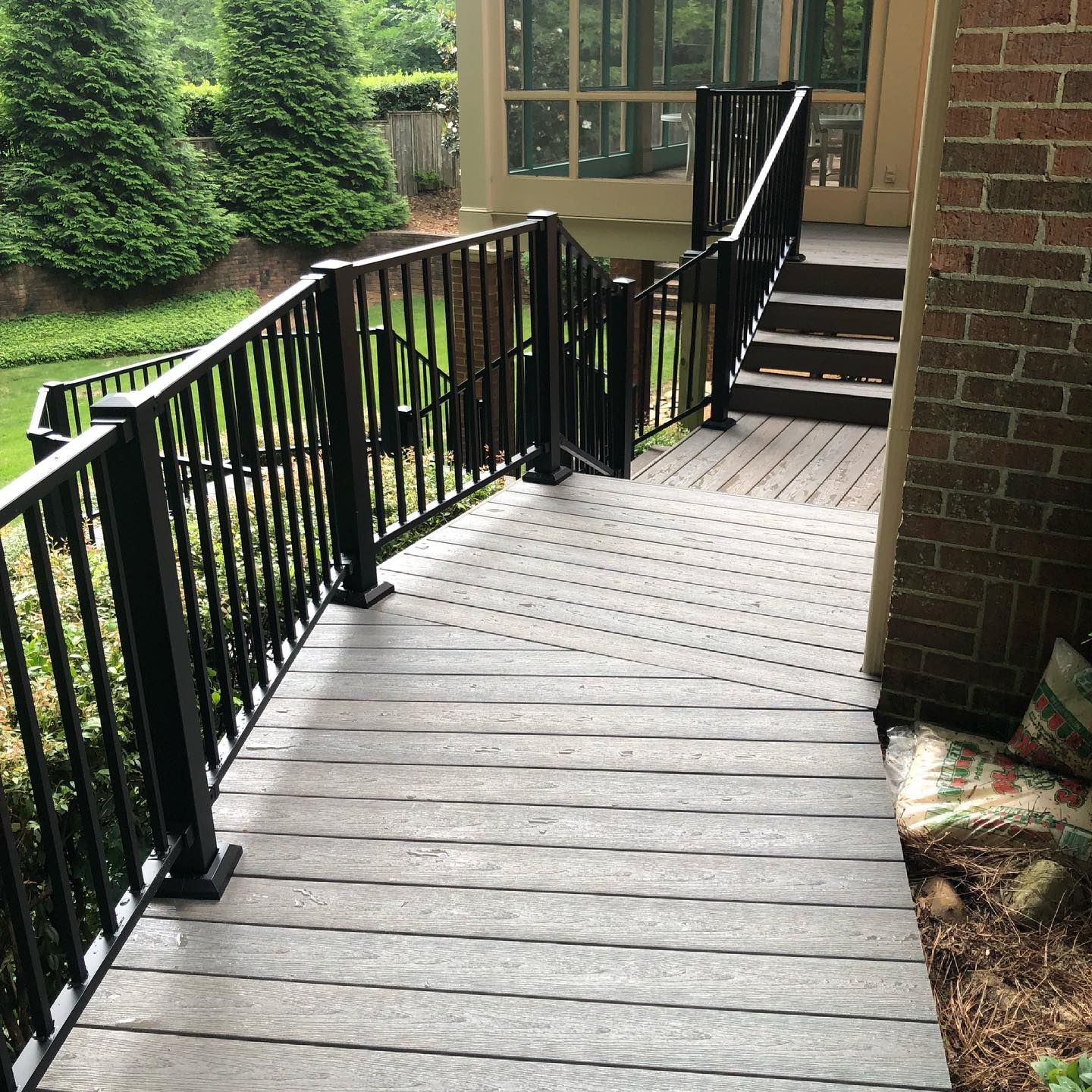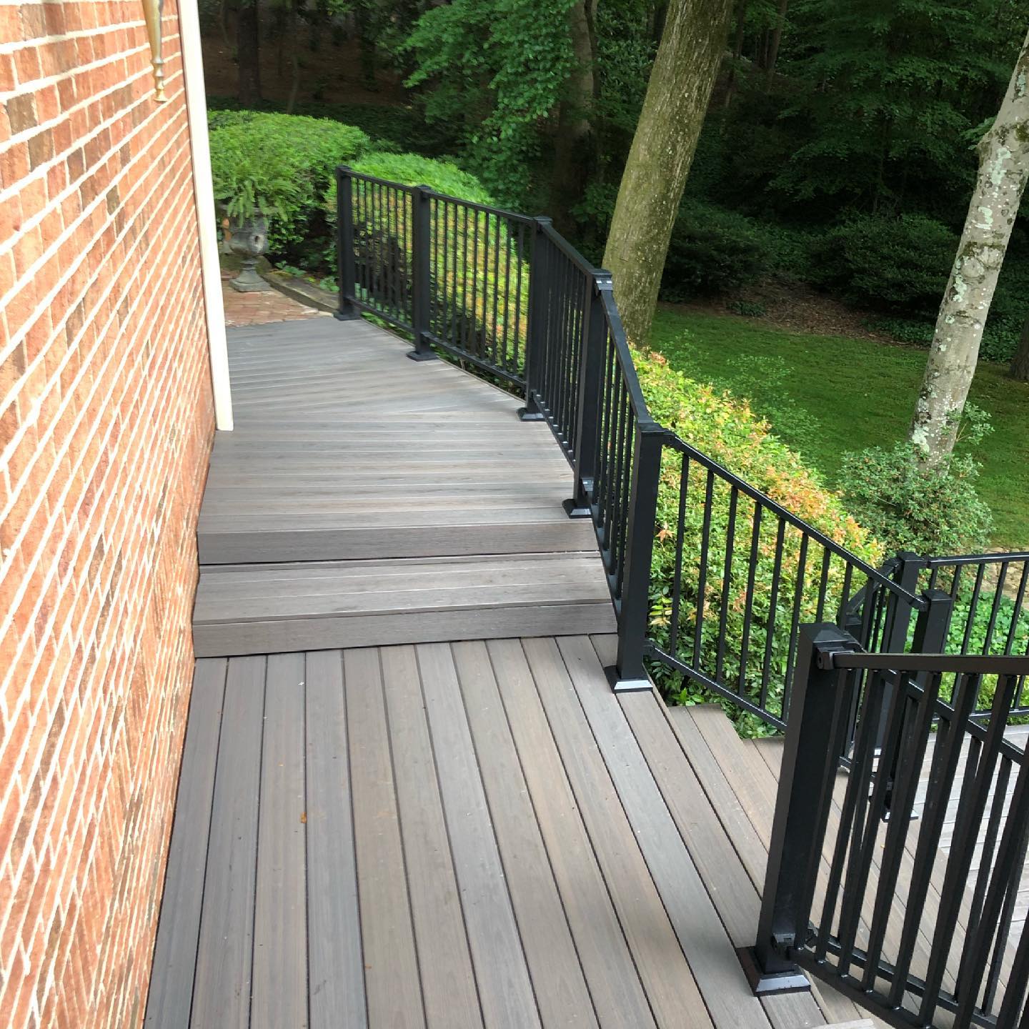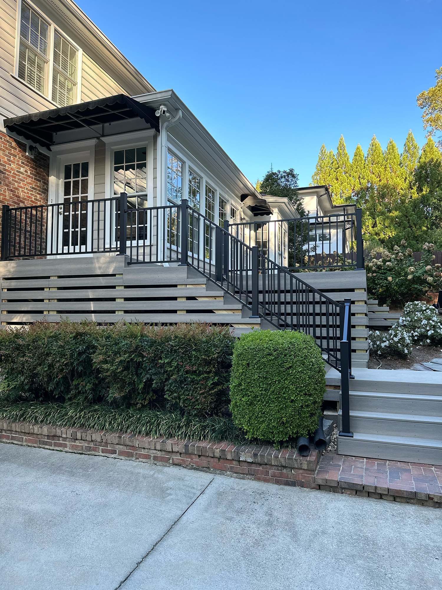 Full tear down and rebuild. First time using MoistureShield composite decking. Composite is notoriously hot in direct sun, and I can say this brand is considerably cooler than others. Complete with my favorite Fortress aluminum railing system. This build was a lot more complicated than I anticipated. Specifically the multiple landings connected with various stairs. Lot of geometry to calculate the spacing and height of steps to maintain proper building code while also meeting the upgraded hardscape pathway elevations. For the walkway, we used the original footprint, which is why the joints are a bit larger than normal. We added a solid two inch base along with a layer of mortar before filling all the joints and gaps. Now this walkway is level, safe, easy to walk on, and will last a very long time. No more risk of injury or rolled ankles.
