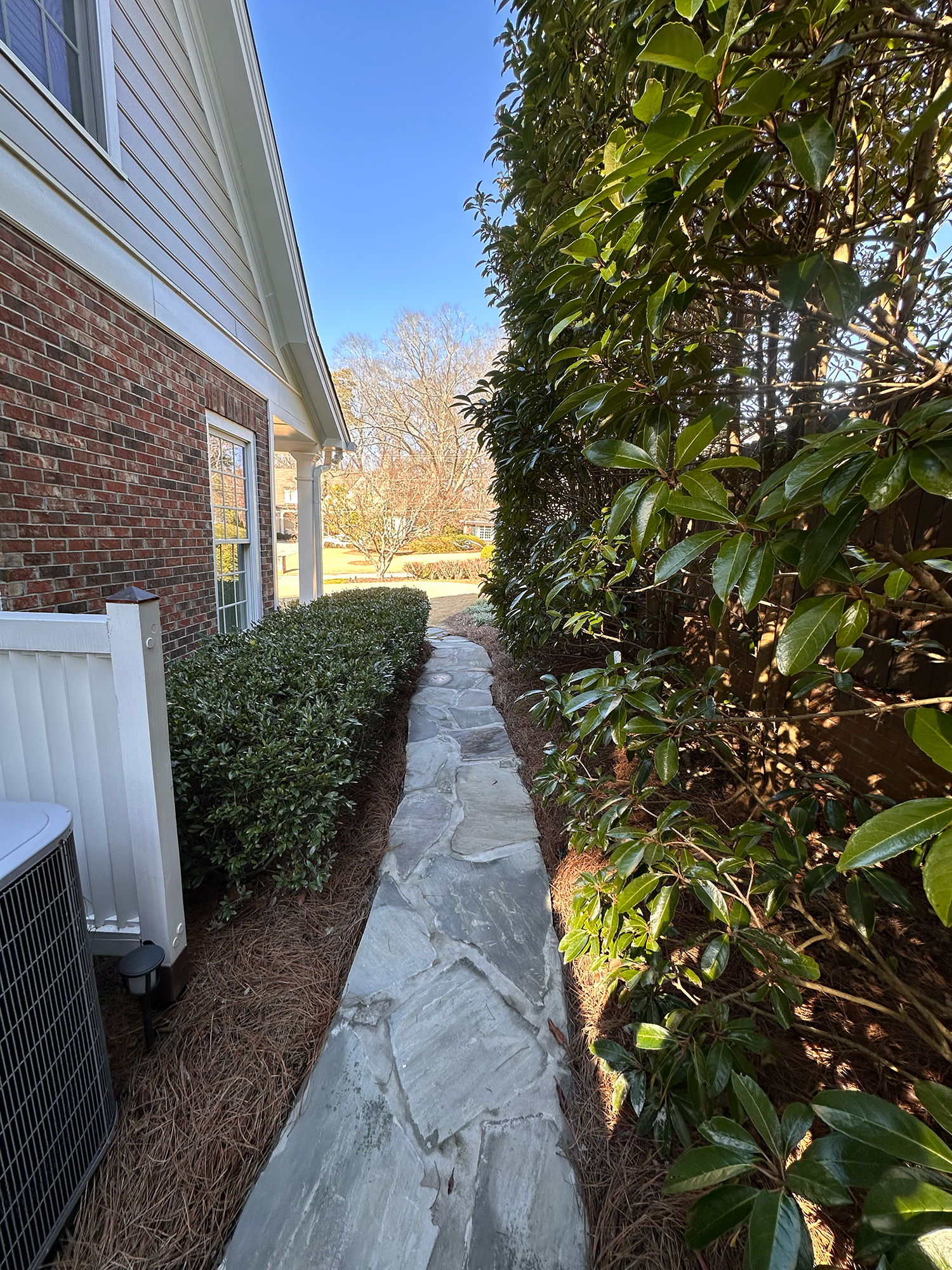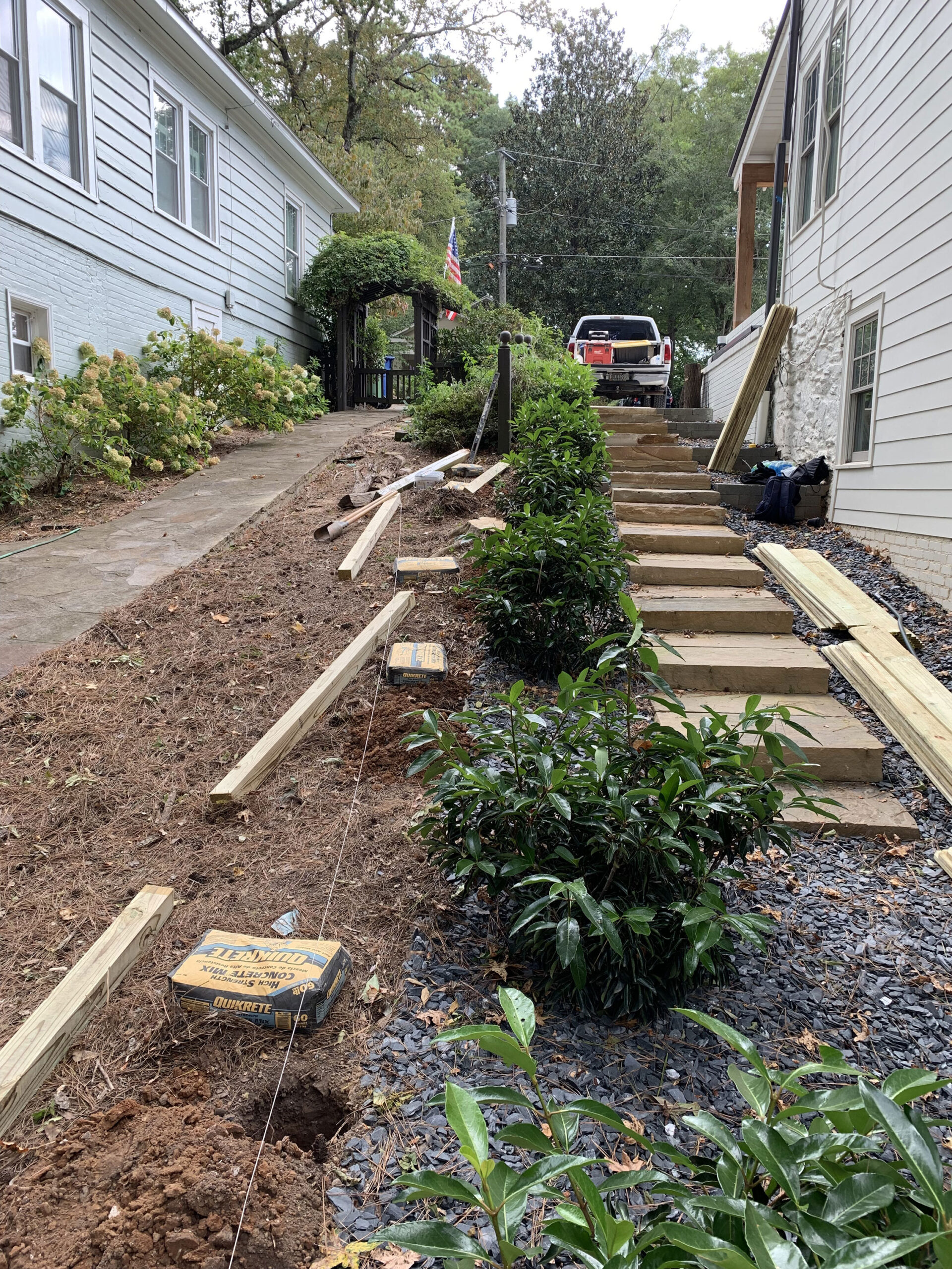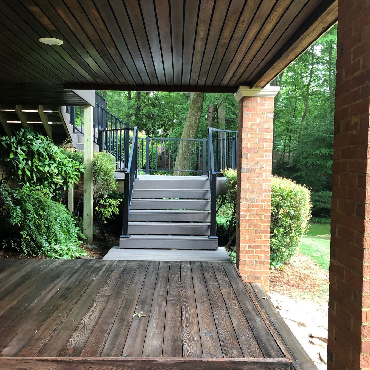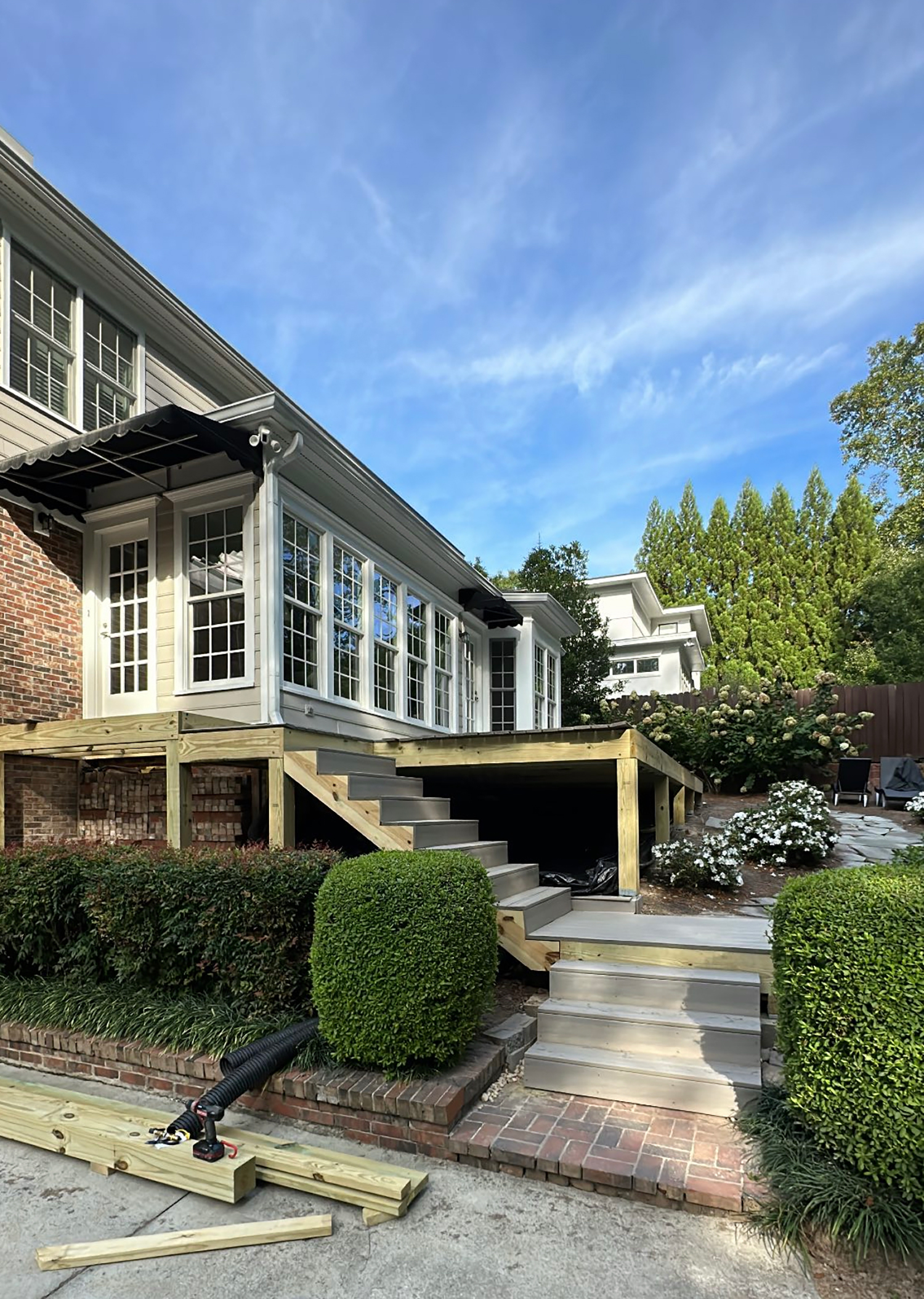 Full tear down and rebuild. First time using MoistureShield composite decking. Composite is notoriously hot in direct sun, and I can say this brand is considerably cooler than others. Complete with my favorite Fortress aluminum railing system. This build was a lot more complicated than I anticipated. Specifically the multiple landings connected with various stairs. Lot of geometry to calculate the spacing and height of steps to maintain proper building code while also meeting the upgraded hardscape pathway elevations. For the walkway, we used the original footprint, which is why the joints are a bit larger than normal. We added a solid two inch base along with a layer of mortar before filling all the joints and gaps. Now this walkway is level, safe, easy to walk on, and will last a very long time. No more risk of injury or rolled ankles.