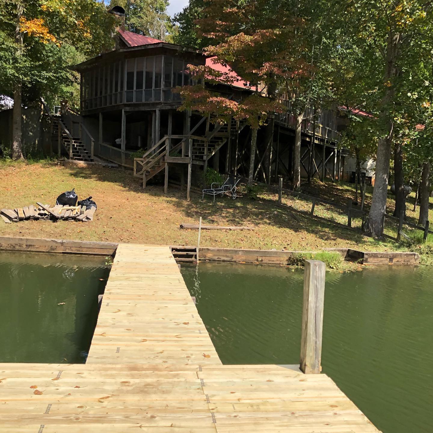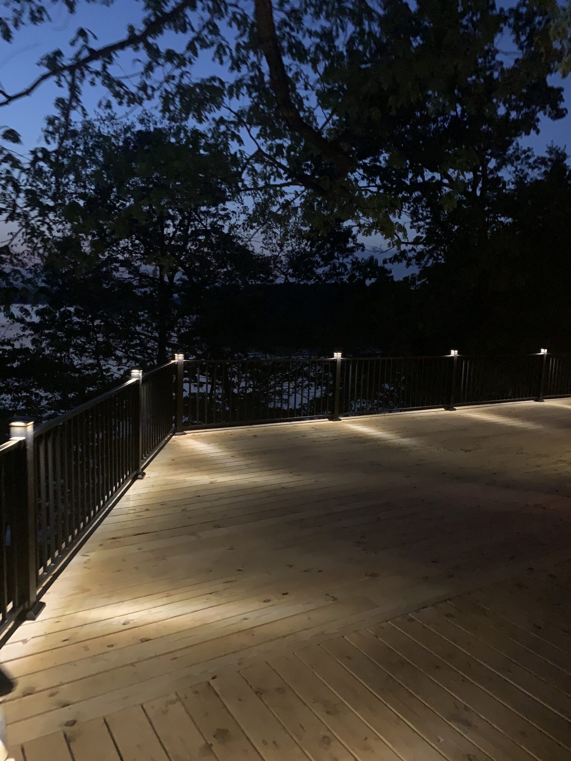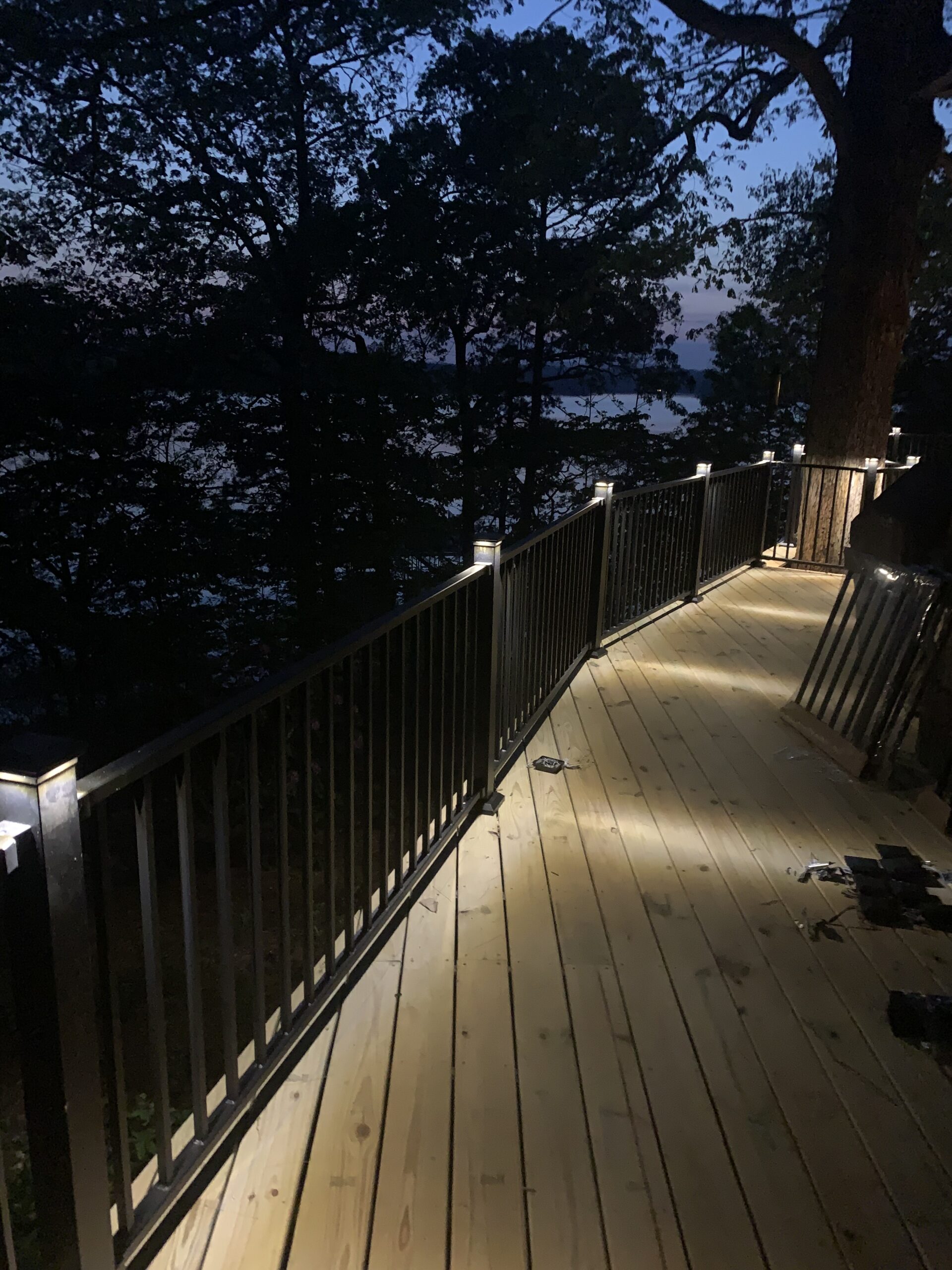 Rebuild & upgrade for this 2,000 square foot lake front home. We replaced two 10×10 beams that were 12’ long, removed an under-decking drainage system that was causing rot and structural failure, installed new aluminum railing with hardwired LED post lights, and extended the pavers for a nice entrance at the front steps! We love the view, the oak tree, and the warm feeling of the night time lighting.