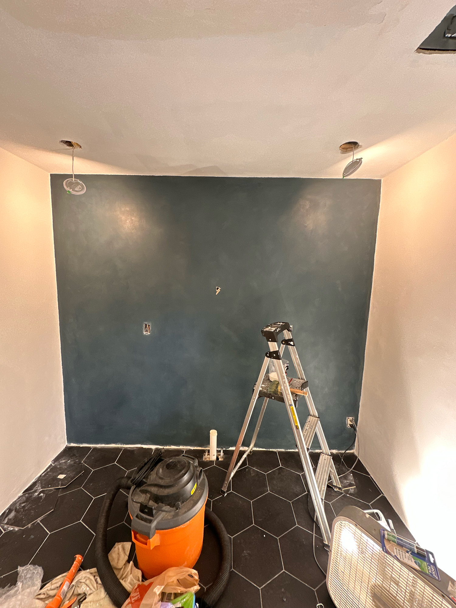 - Three walls made of Tadelakt Moroccan plaster. A tedious and painstaking process that turned out perfectly. The Tadelakt process: plywood, waterproof membrane, metal lathe, two coats masonry mix (stucco), two coats Tadelakt base, two topcoats white Tadelakt topcoat from Color Atelier, followed by three coats beeswax to seal it all. 24 hour dry time between coats.